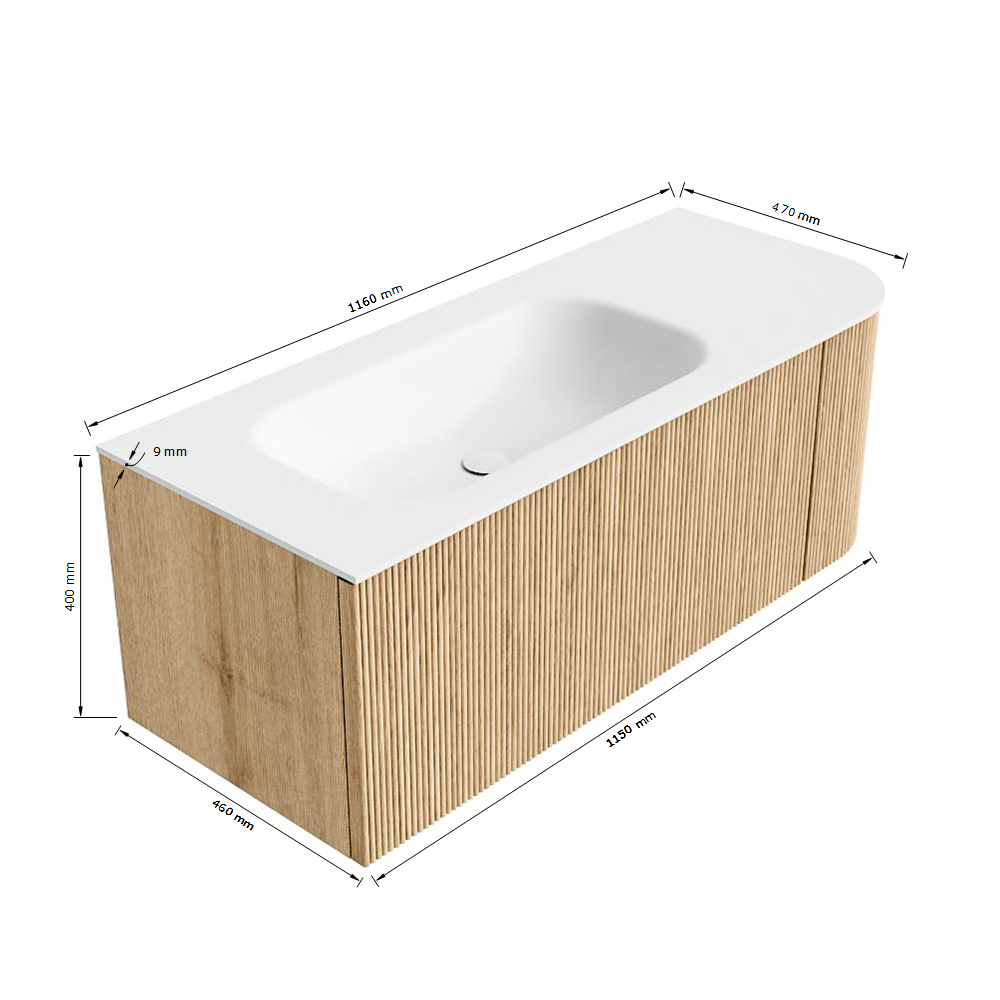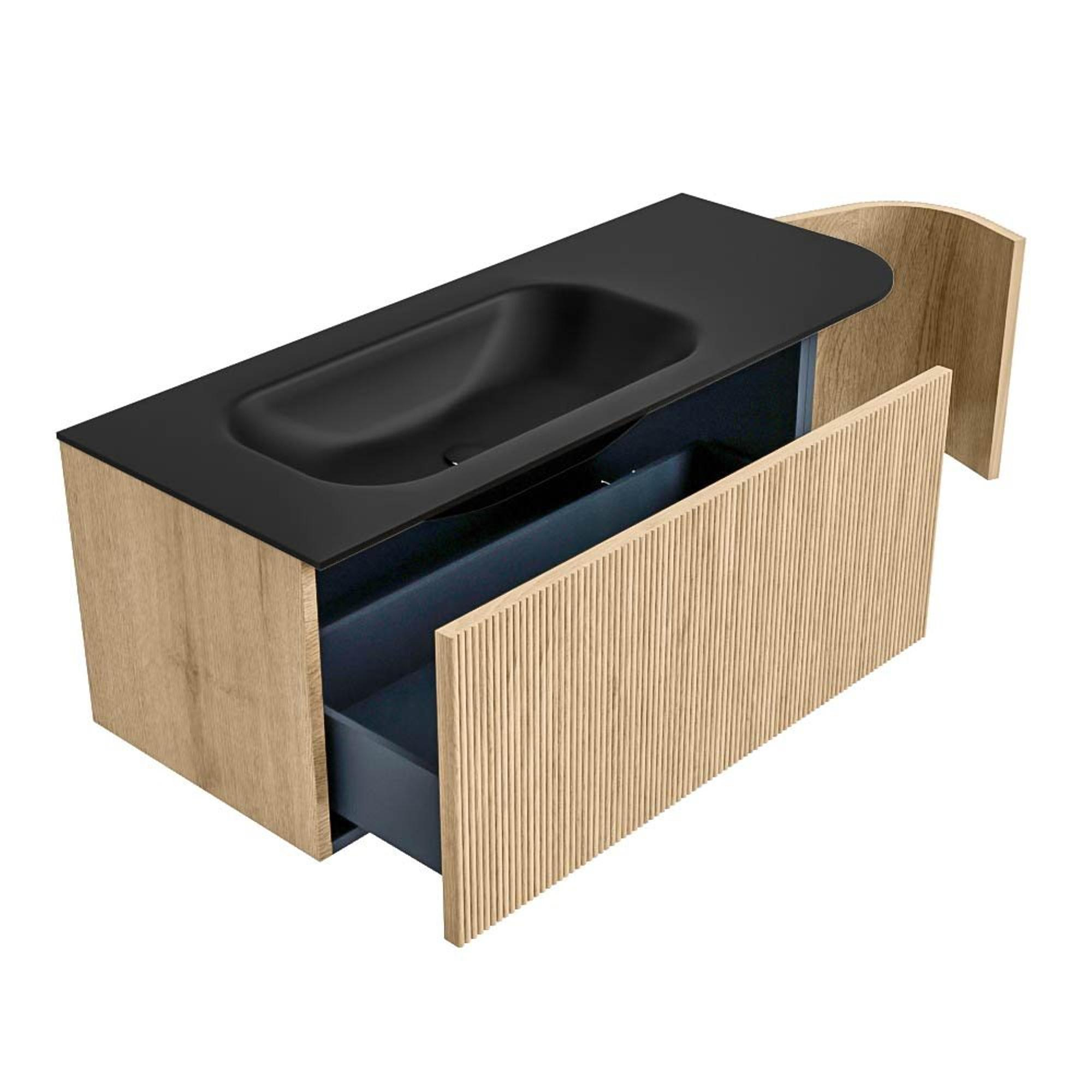 MONDIAZ KURVE 115cm badmeubel met module 25 R kleur Oak met 1 lade en 1 deur. Wastafel BIG SMALL links zonder kraangat Urban.