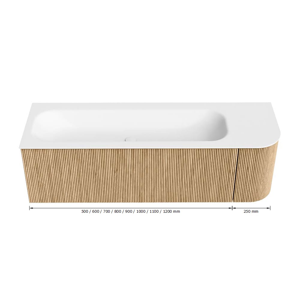 Het ultieme badmeubel dat je badkamer transformeert tot een oase van verfijning. Met zijn halfronde, verticale stroken van massief eiken, verkrijgbaar in de kleuren Oak en Walnut, straalt KURVE vakmanschap uit in elk detail. De zachte rondingen en slim ontworpen deurtjes, elk 40cm hoog, nodigen uit tot gebruik, terwijl de ruimte binnenin optimaal benut wordt dankzij de royale lade van dezelfde hoogte.