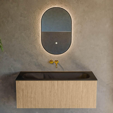 Het ultieme badmeubel dat je badkamer transformeert tot een oase van verfijning. Met zijn halfronde, verticale stroken van massief eiken, verkrijgbaar in de kleuren Oak en Walnut, straalt KURVE vakmanschap uit in elk detail. De zachte rondingen en slim ontworpen deurtjes, elk 40cm hoog, nodigen uit tot gebruik, terwijl de ruimte binnenin optimaal benut wordt dankzij de royale lade van dezelfde hoogte.