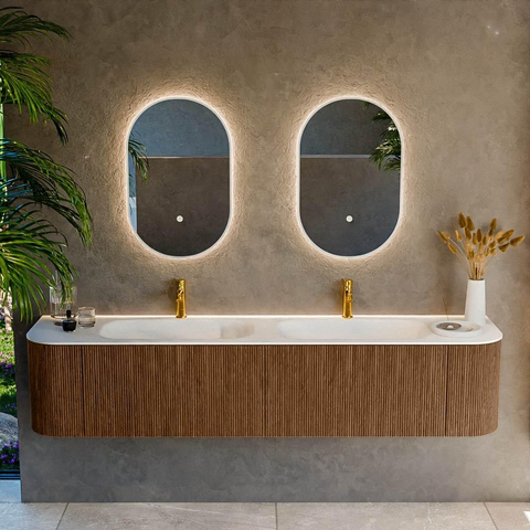Het ultieme badmeubel dat je badkamer transformeert tot een oase van verfijning. Met zijn halfronde, verticale stroken van massief eiken, verkrijgbaar in de kleuren Oak en Walnut, straalt KURVE vakmanschap uit in elk detail. De zachte rondingen en slim ontworpen deurtjes, elk 40cm hoog, nodigen uit tot gebruik, terwijl de ruimte binnenin optimaal benut wordt dankzij de royale lade van dezelfde hoogte.