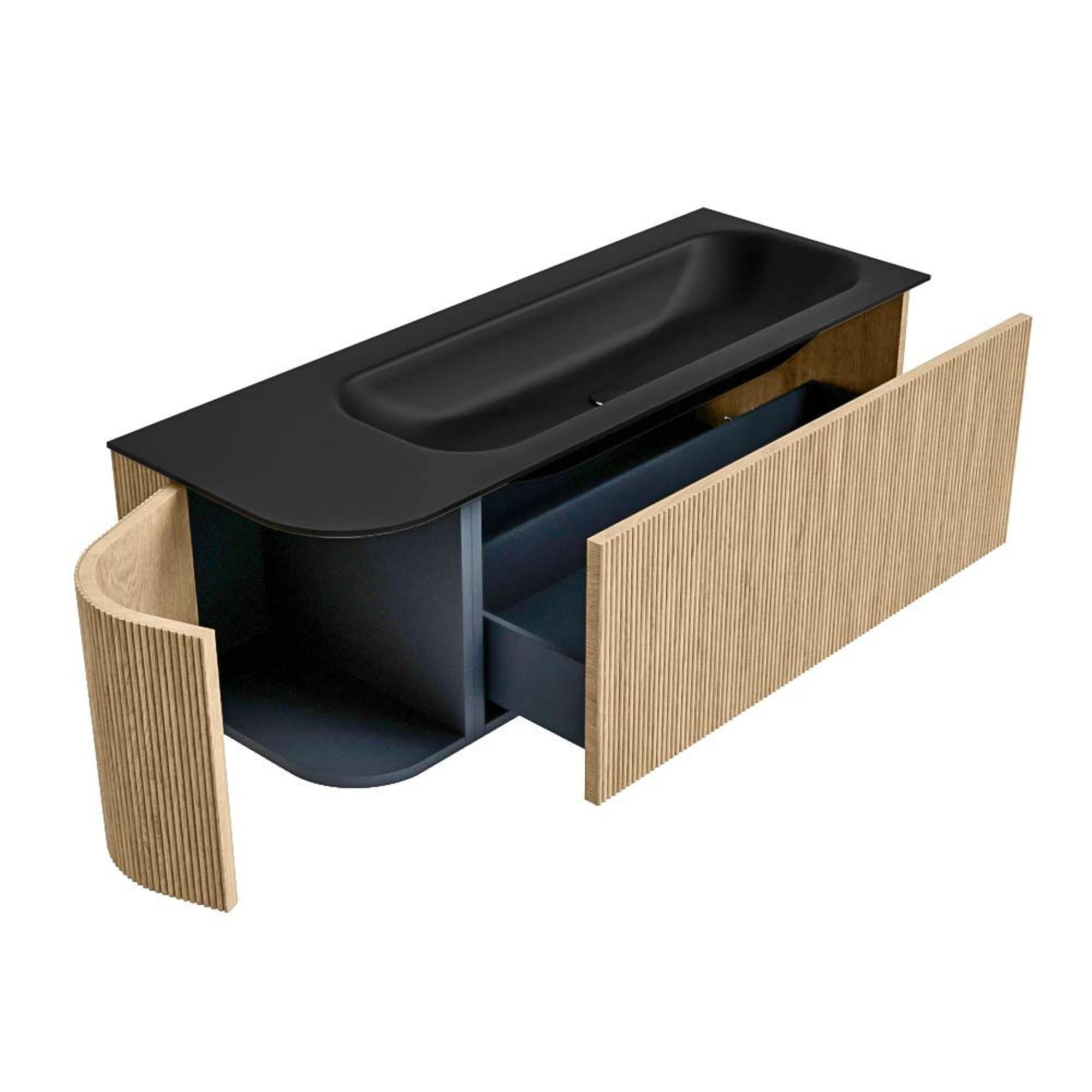 Het ultieme badmeubel dat je badkamer transformeert tot een oase van verfijning. Met zijn halfronde, verticale stroken van massief eiken, verkrijgbaar in de kleuren Oak en Walnut, straalt KURVE vakmanschap uit in elk detail. De zachte rondingen en slim ontworpen deurtjes, elk 40cm hoog, nodigen uit tot gebruik, terwijl de ruimte binnenin optimaal benut wordt dankzij de royale lade van dezelfde hoogte.