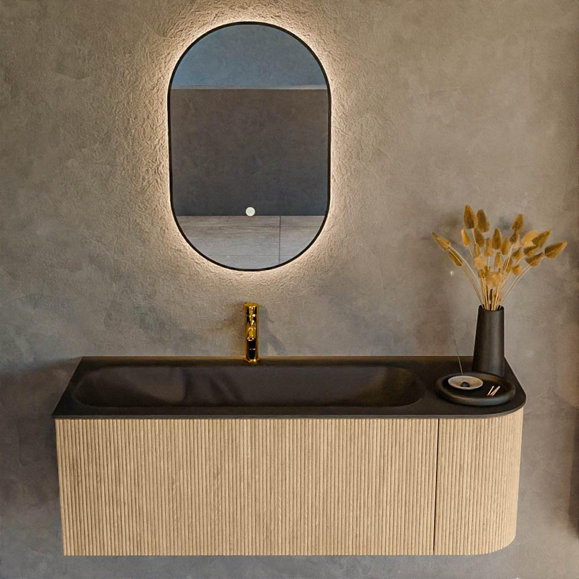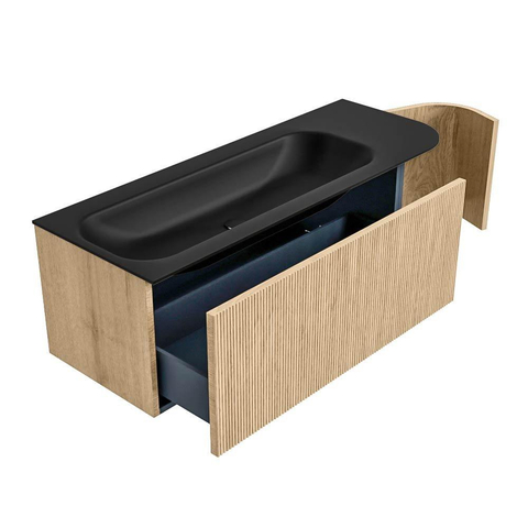 MONDIAZ KURVE 125cm badmeubel met module 25 R kleur Oak met 1 lade en 1 deur. Wastafel BIG MEDIUM links 1 kraangat Urban.