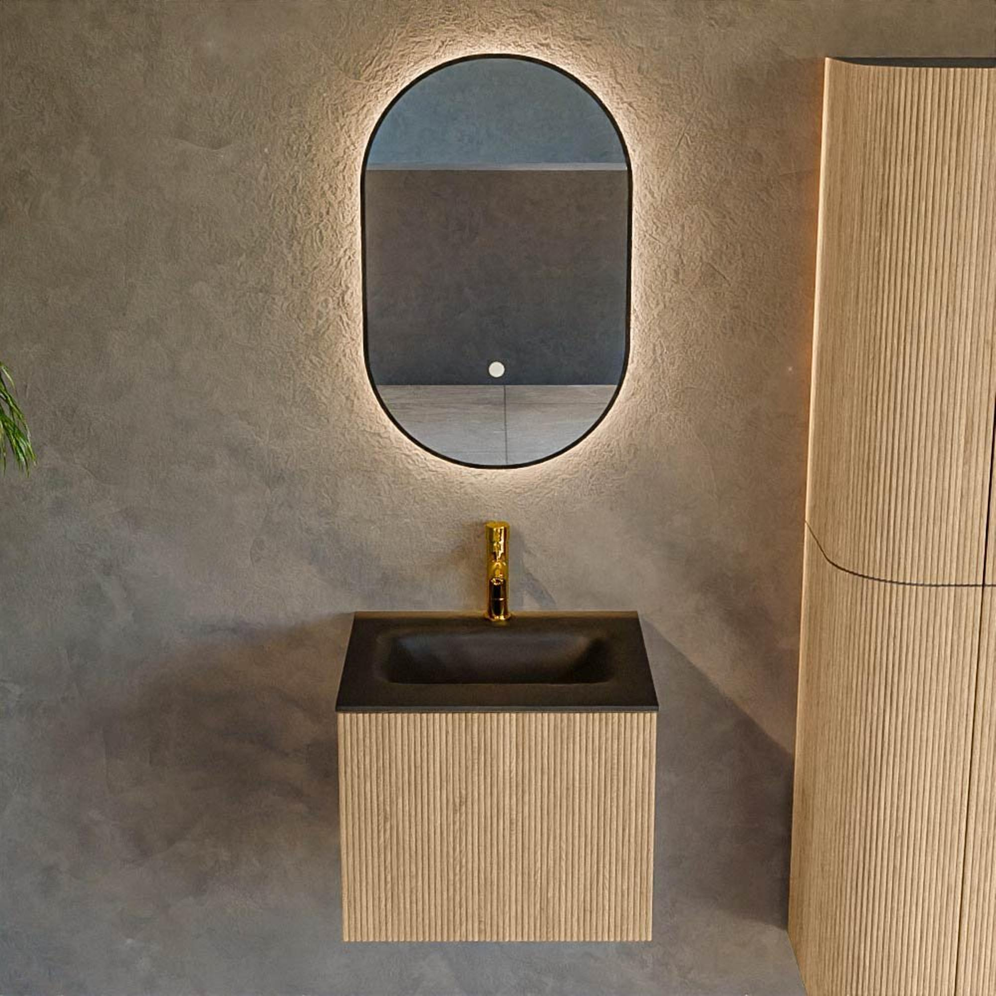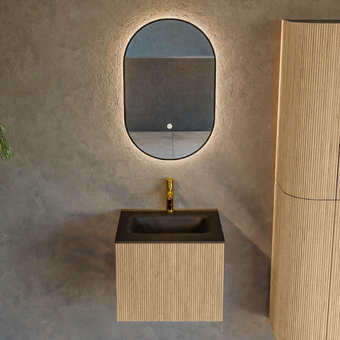 MONDIAZ KURVE 50cm badmeubel kleur Oak met 1 lade. Wastafel GRUNNE midden 1 kraangat Urban.