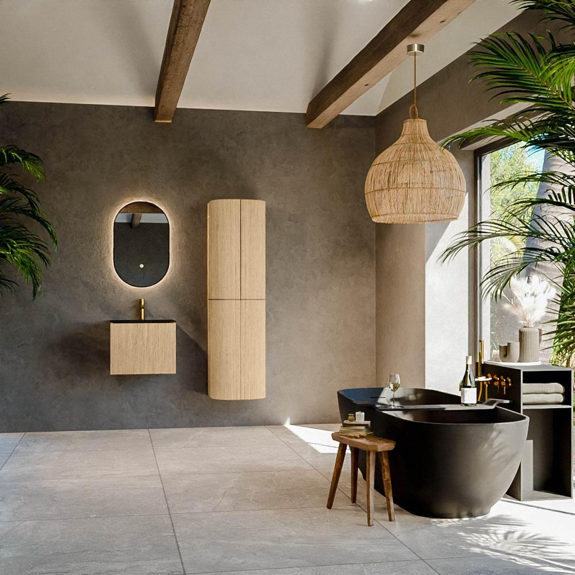 Het ultieme badmeubel dat je badkamer transformeert tot een oase van verfijning. Met zijn halfronde, verticale stroken van massief eiken, verkrijgbaar in de kleuren Oak en Walnut, straalt KURVE vakmanschap uit in elk detail. De zachte rondingen en slim ontworpen deurtjes, elk 40cm hoog, nodigen uit tot gebruik, terwijl de ruimte binnenin optimaal benut wordt dankzij de royale lade van dezelfde hoogte.