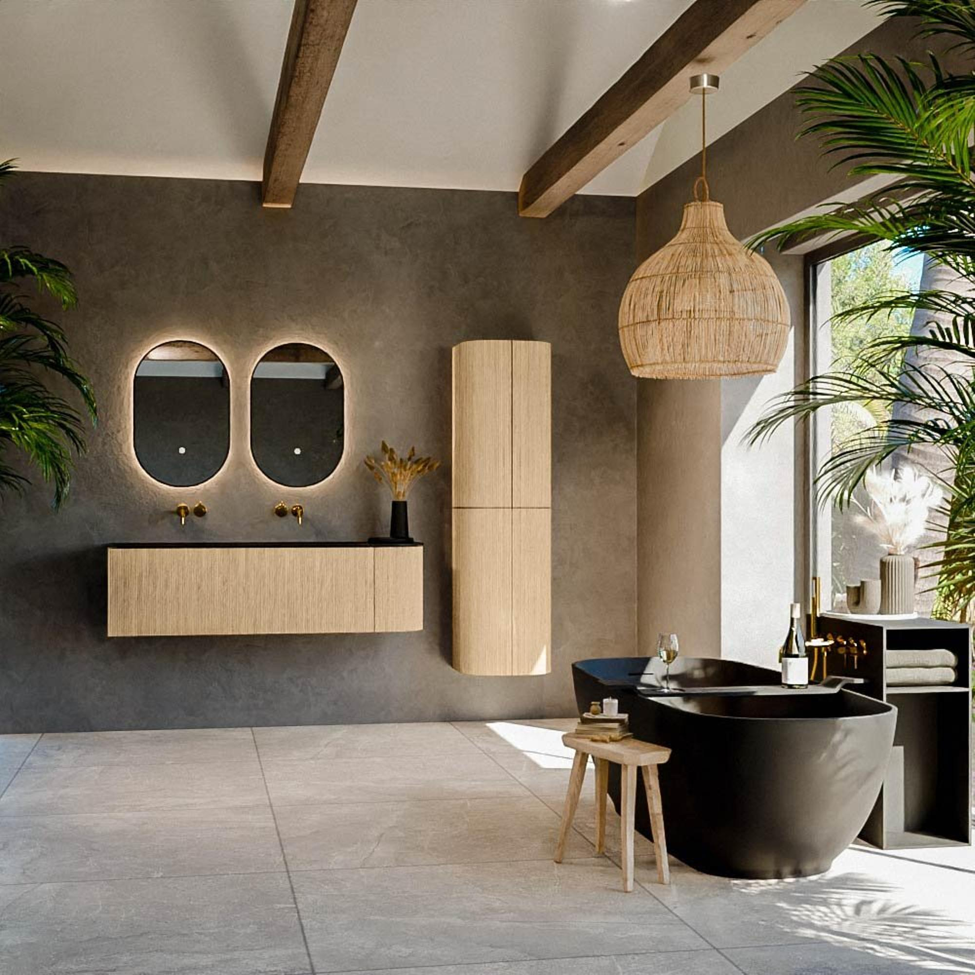 Het ultieme badmeubel dat je badkamer transformeert tot een oase van verfijning. Met zijn halfronde, verticale stroken van massief eiken, verkrijgbaar in de kleuren Oak en Walnut, straalt KURVE vakmanschap uit in elk detail. De zachte rondingen en slim ontworpen deurtjes, elk 40cm hoog, nodigen uit tot gebruik, terwijl de ruimte binnenin optimaal benut wordt dankzij de royale lade van dezelfde hoogte.