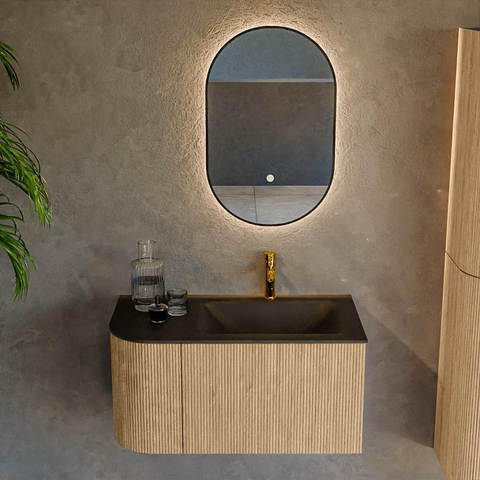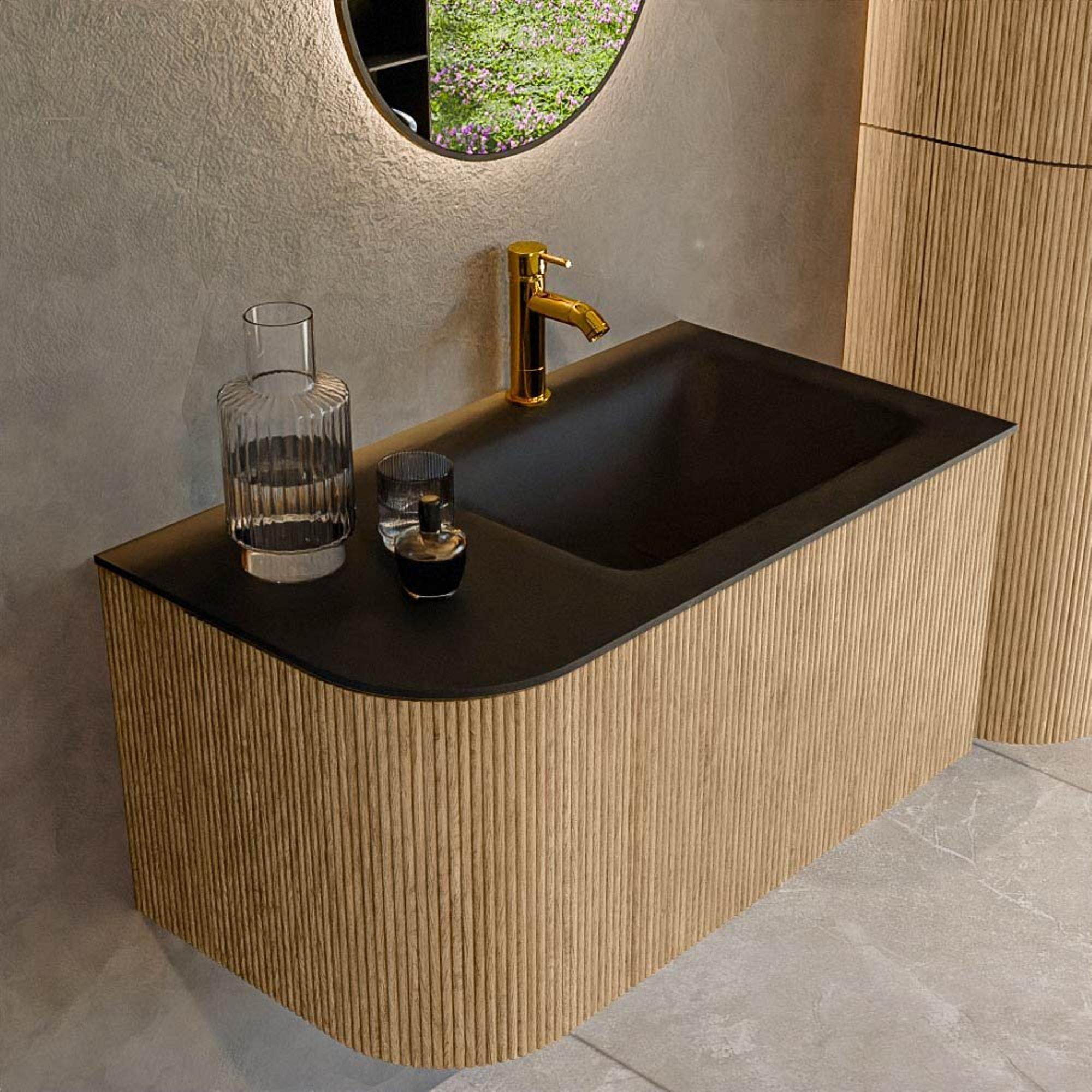 Het ultieme badmeubel dat je badkamer transformeert tot een oase van verfijning. Met zijn halfronde, verticale stroken van massief eiken, verkrijgbaar in de kleuren Oak en Walnut, straalt KURVE vakmanschap uit in elk detail. De zachte rondingen en slim ontworpen deurtjes, elk 40cm hoog, nodigen uit tot gebruik, terwijl de ruimte binnenin optimaal benut wordt dankzij de royale lade van dezelfde hoogte.