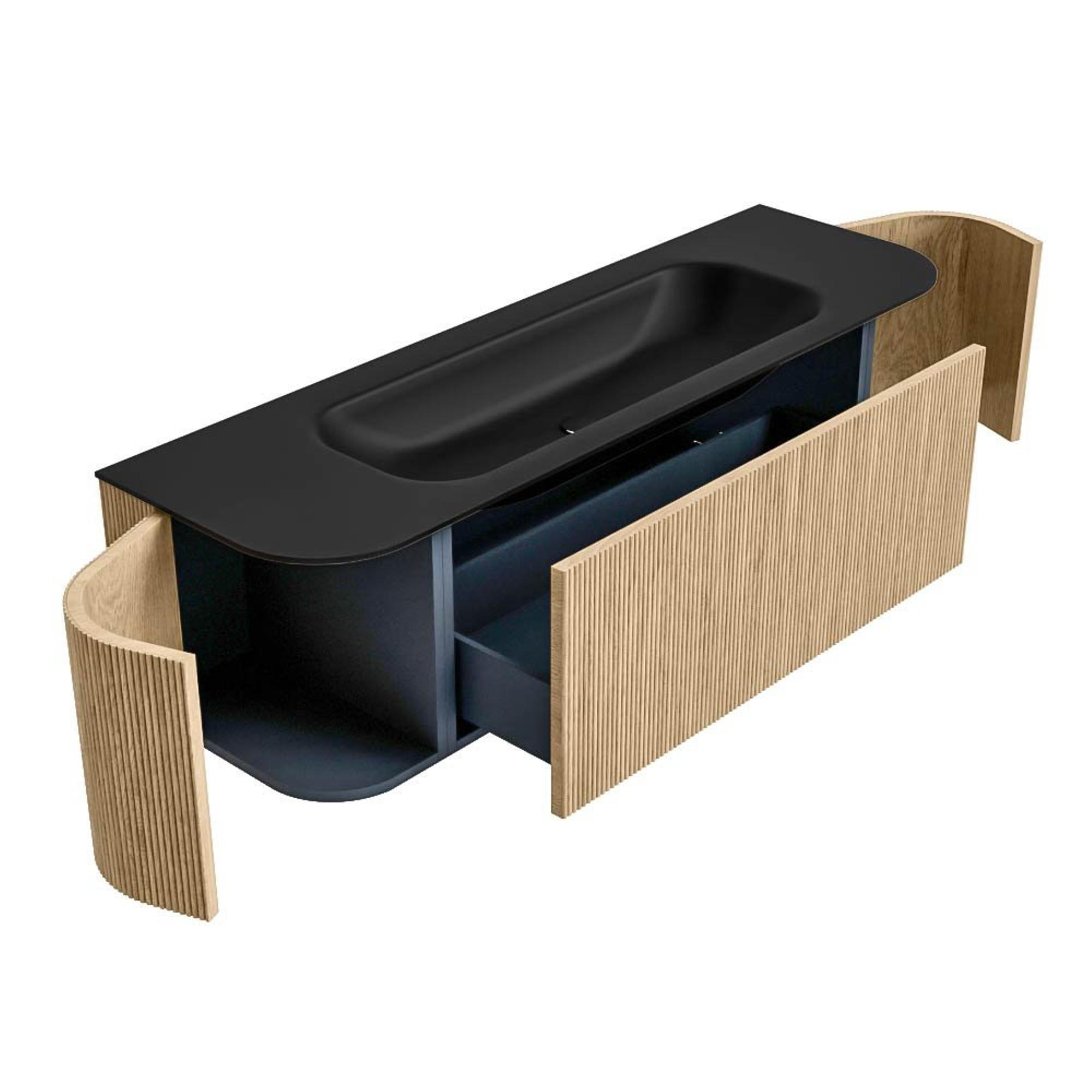 Het ultieme badmeubel dat je badkamer transformeert tot een oase van verfijning. Met zijn halfronde, verticale stroken van massief eiken, verkrijgbaar in de kleuren Oak en Walnut, straalt KURVE vakmanschap uit in elk detail. De zachte rondingen en slim ontworpen deurtjes, elk 40cm hoog, nodigen uit tot gebruik, terwijl de ruimte binnenin optimaal benut wordt dankzij de royale lade van dezelfde hoogte.