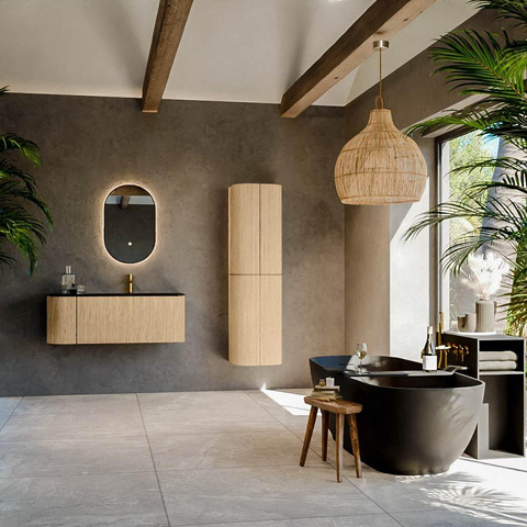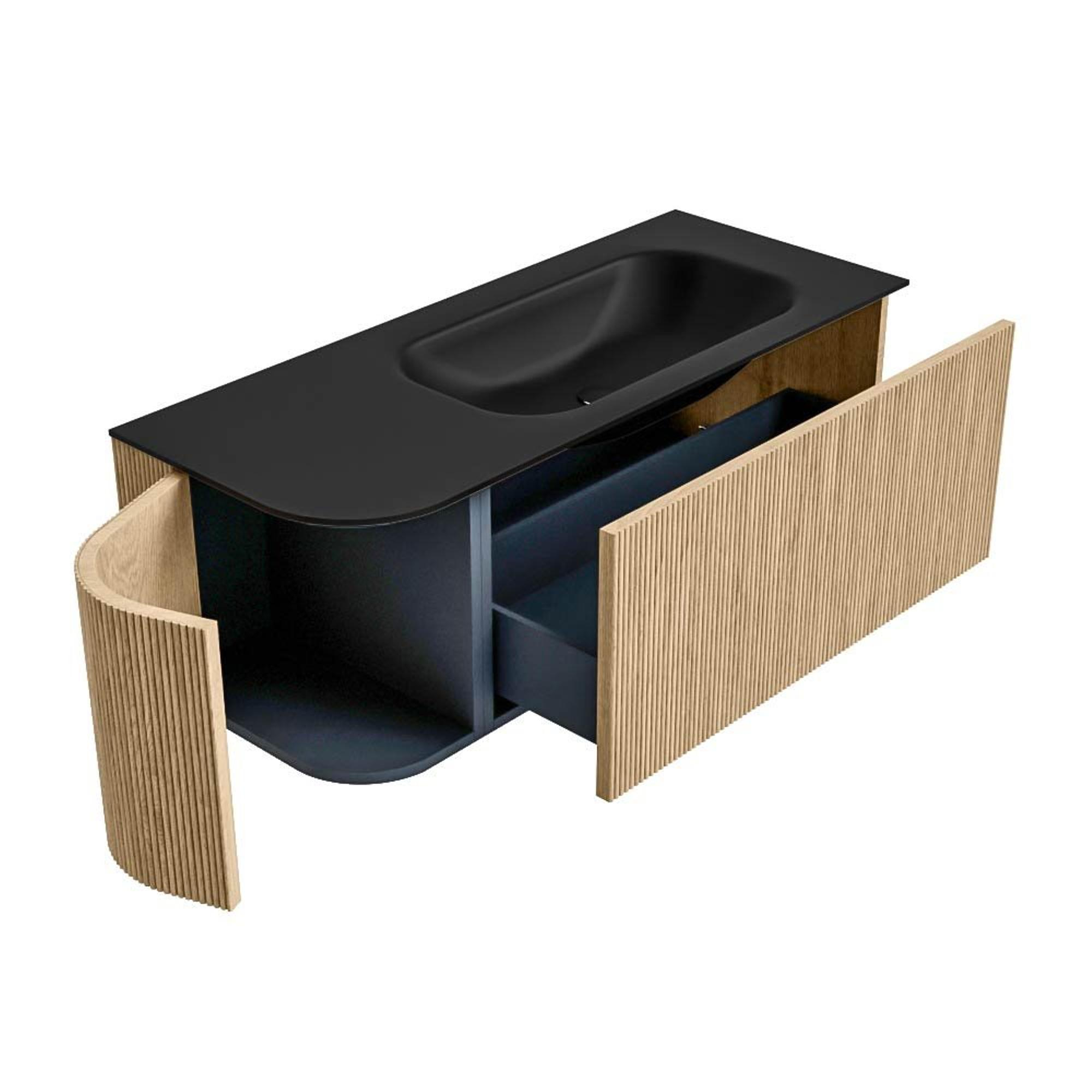 Het ultieme badmeubel dat je badkamer transformeert tot een oase van verfijning. Met zijn halfronde, verticale stroken van massief eiken, verkrijgbaar in de kleuren Oak en Walnut, straalt KURVE vakmanschap uit in elk detail. De zachte rondingen en slim ontworpen deurtjes, elk 40cm hoog, nodigen uit tot gebruik, terwijl de ruimte binnenin optimaal benut wordt dankzij de royale lade van dezelfde hoogte.
