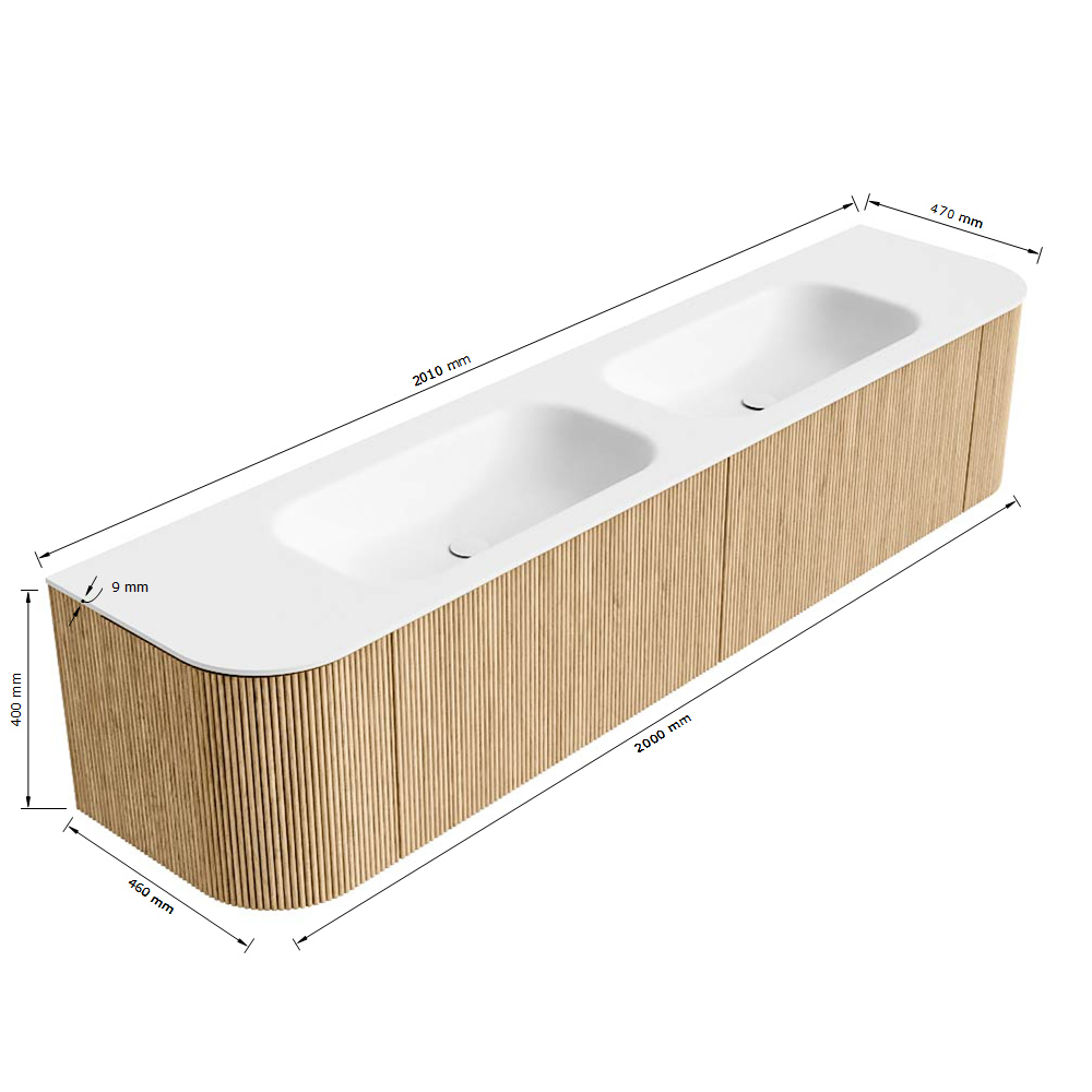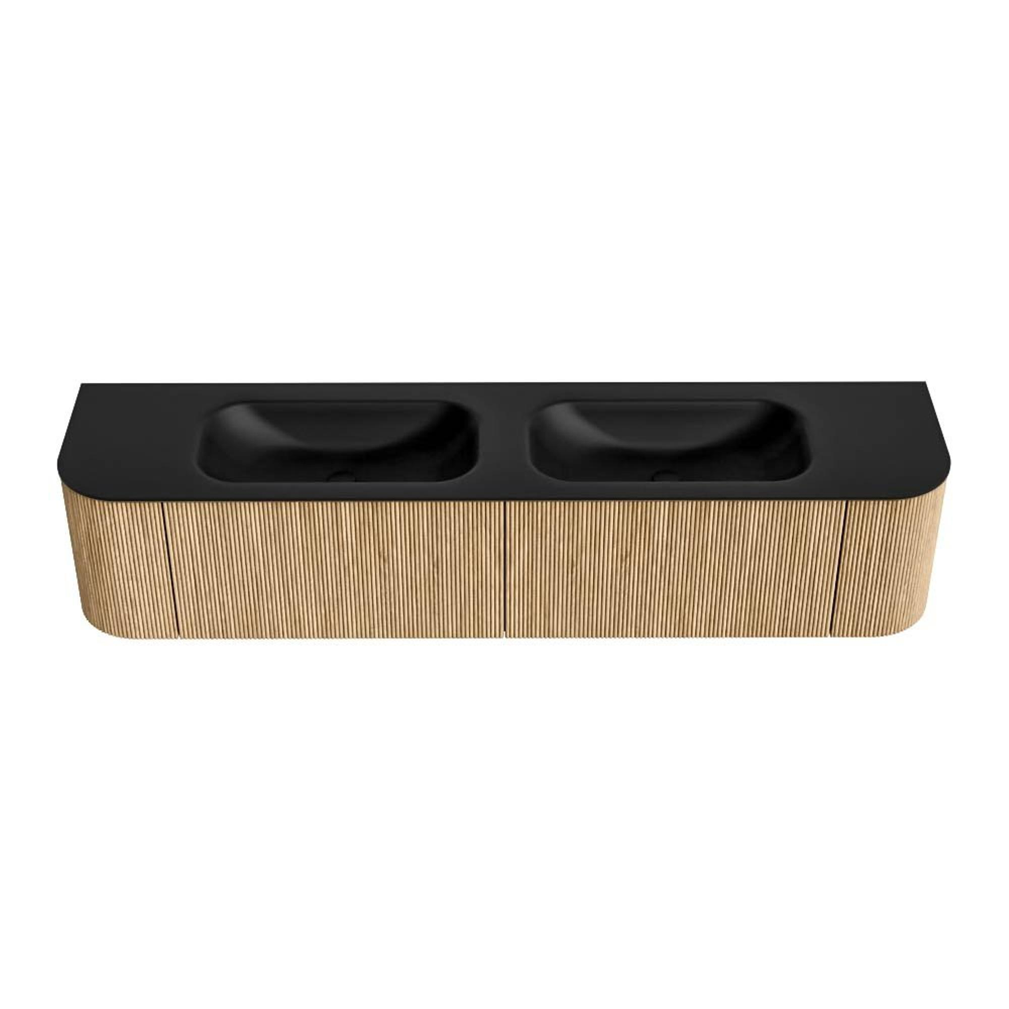 MONDIAZ KURVE 200cm badmeubel met module 25 Len R kleur Oak met 2 lades en 2 deuren. Wastafel BIG SMALL dubbel zonder kraangat Urban.