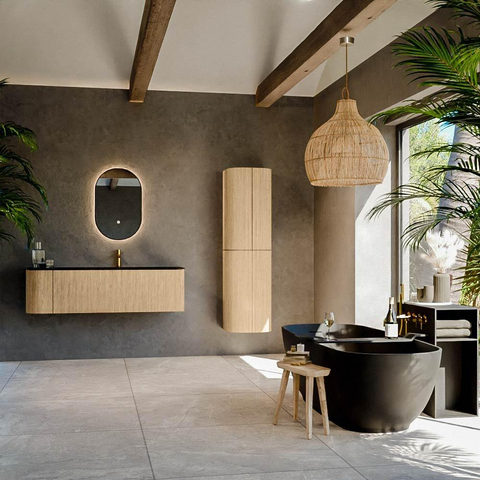Het ultieme badmeubel dat je badkamer transformeert tot een oase van verfijning. Met zijn halfronde, verticale stroken van massief eiken, verkrijgbaar in de kleuren Oak en Walnut, straalt KURVE vakmanschap uit in elk detail. De zachte rondingen en slim ontworpen deurtjes, elk 40cm hoog, nodigen uit tot gebruik, terwijl de ruimte binnenin optimaal benut wordt dankzij de royale lade van dezelfde hoogte.