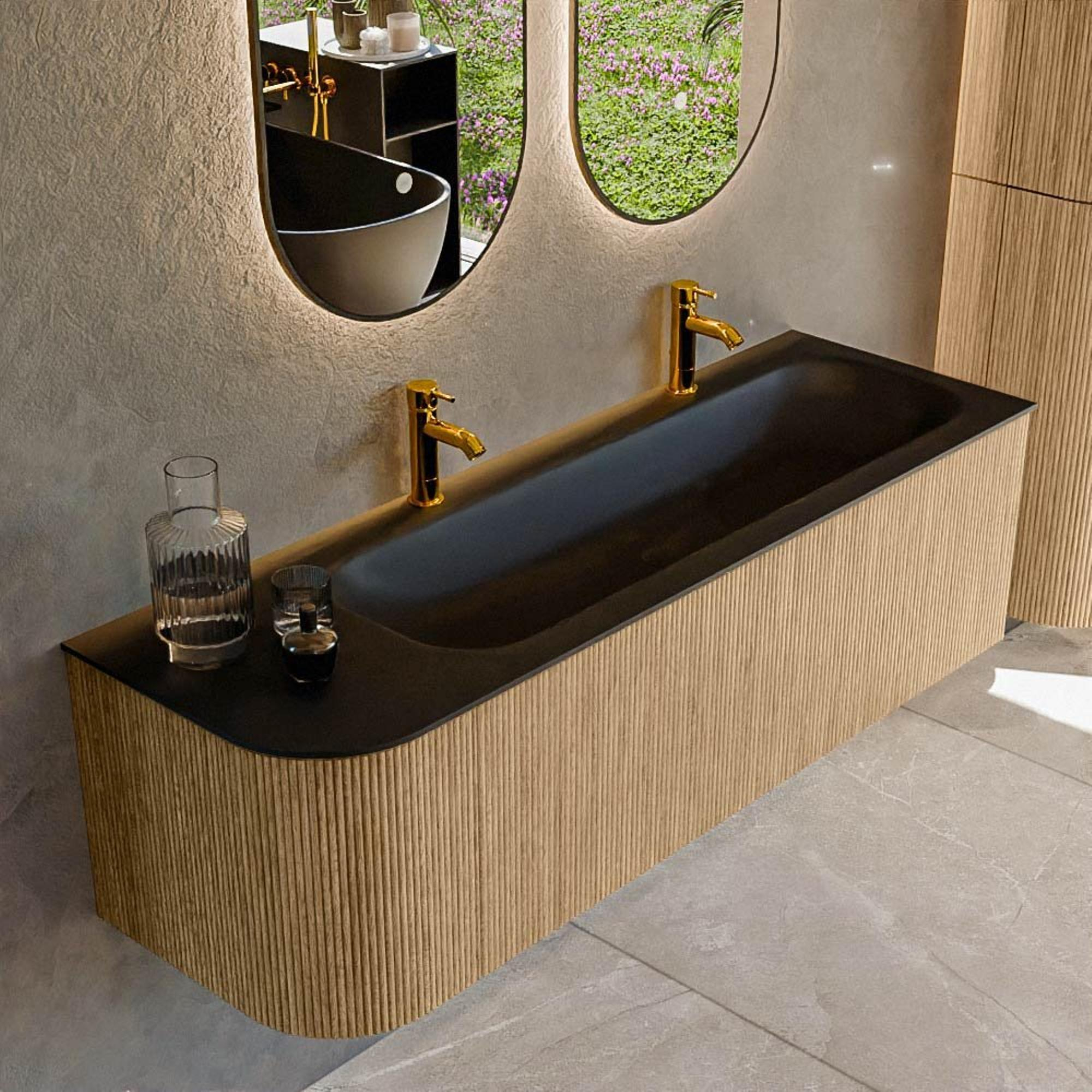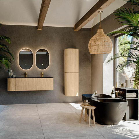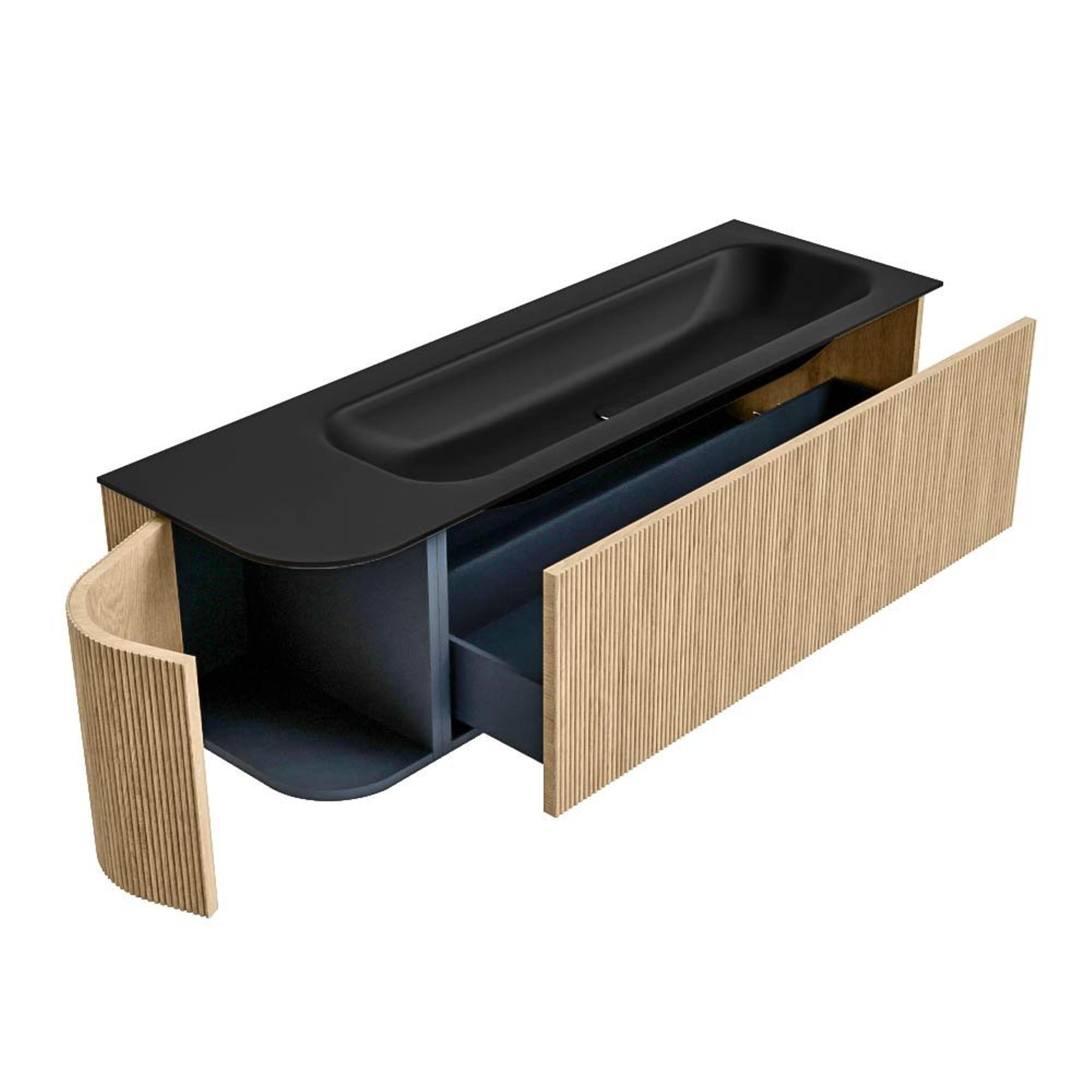 Het ultieme badmeubel dat je badkamer transformeert tot een oase van verfijning. Met zijn halfronde, verticale stroken van massief eiken, verkrijgbaar in de kleuren Oak en Walnut, straalt KURVE vakmanschap uit in elk detail. De zachte rondingen en slim ontworpen deurtjes, elk 40cm hoog, nodigen uit tot gebruik, terwijl de ruimte binnenin optimaal benut wordt dankzij de royale lade van dezelfde hoogte.