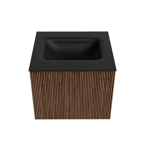MONDIAZ KURVE 50cm badmeubel kleur Walnut met 1 lade. Wastafel GRUNNE midden zonder kraangat Urban.