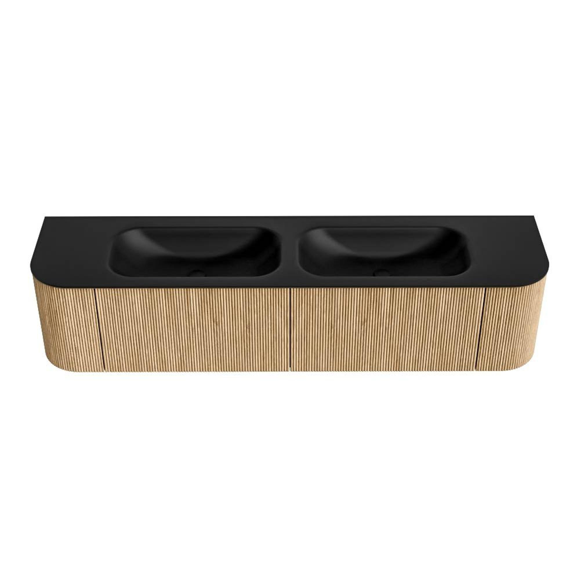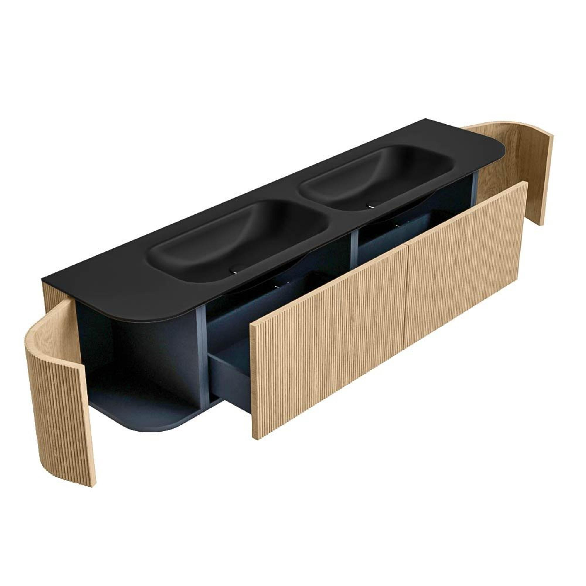 Het ultieme badmeubel dat je badkamer transformeert tot een oase van verfijning. Met zijn halfronde, verticale stroken van massief eiken, verkrijgbaar in de kleuren Oak en Walnut, straalt KURVE vakmanschap uit in elk detail. De zachte rondingen en slim ontworpen deurtjes, elk 40cm hoog, nodigen uit tot gebruik, terwijl de ruimte binnenin optimaal benut wordt dankzij de royale lade van dezelfde hoogte.