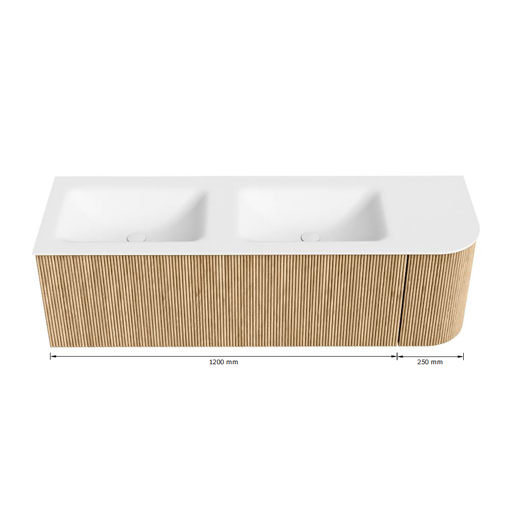 Het ultieme badmeubel dat je badkamer transformeert tot een oase van verfijning. Met zijn halfronde, verticale stroken van massief eiken, verkrijgbaar in de kleuren Oak en Walnut, straalt KURVE vakmanschap uit in elk detail. De zachte rondingen en slim ontworpen deurtjes, elk 40cm hoog, nodigen uit tot gebruik, terwijl de ruimte binnenin optimaal benut wordt dankzij de royale lade van dezelfde hoogte.