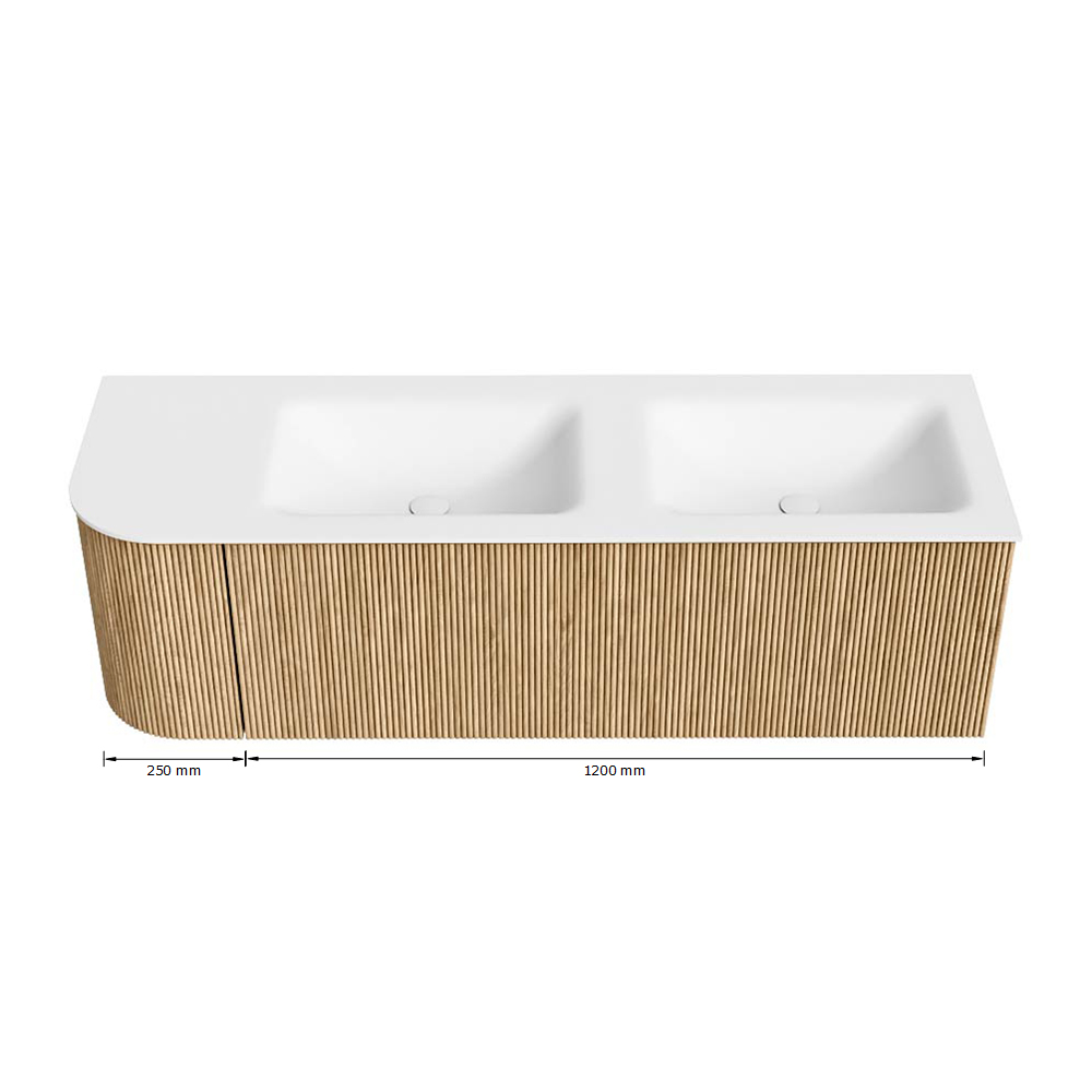 Het ultieme badmeubel dat je badkamer transformeert tot een oase van verfijning. Met zijn halfronde, verticale stroken van massief eiken, verkrijgbaar in de kleuren Oak en Walnut, straalt KURVE vakmanschap uit in elk detail. De zachte rondingen en slim ontworpen deurtjes, elk 40cm hoog, nodigen uit tot gebruik, terwijl de ruimte binnenin optimaal benut wordt dankzij de royale lade van dezelfde hoogte.