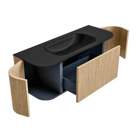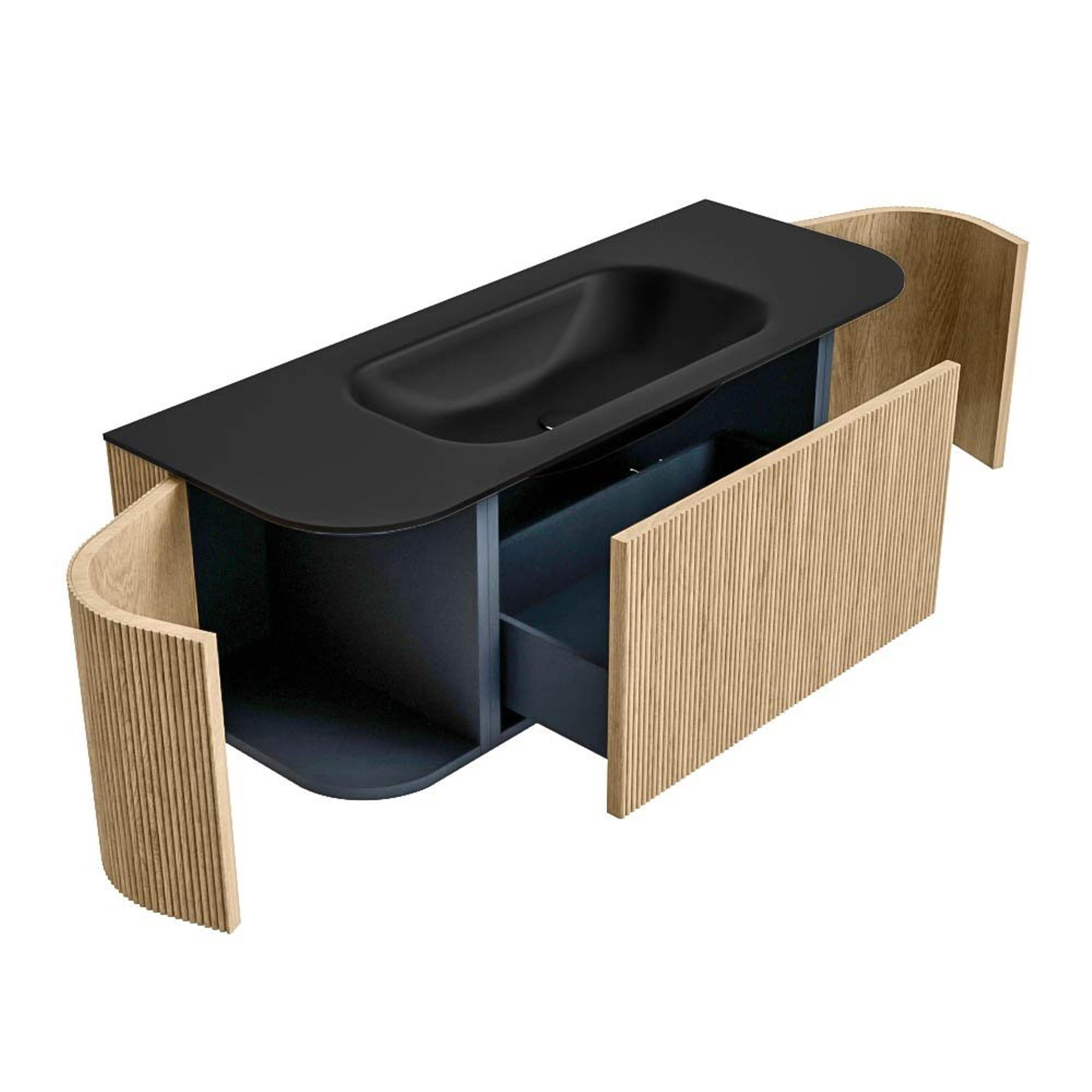 Het ultieme badmeubel dat je badkamer transformeert tot een oase van verfijning. Met zijn halfronde, verticale stroken van massief eiken, verkrijgbaar in de kleuren Oak en Walnut, straalt KURVE vakmanschap uit in elk detail. De zachte rondingen en slim ontworpen deurtjes, elk 40cm hoog, nodigen uit tot gebruik, terwijl de ruimte binnenin optimaal benut wordt dankzij de royale lade van dezelfde hoogte.