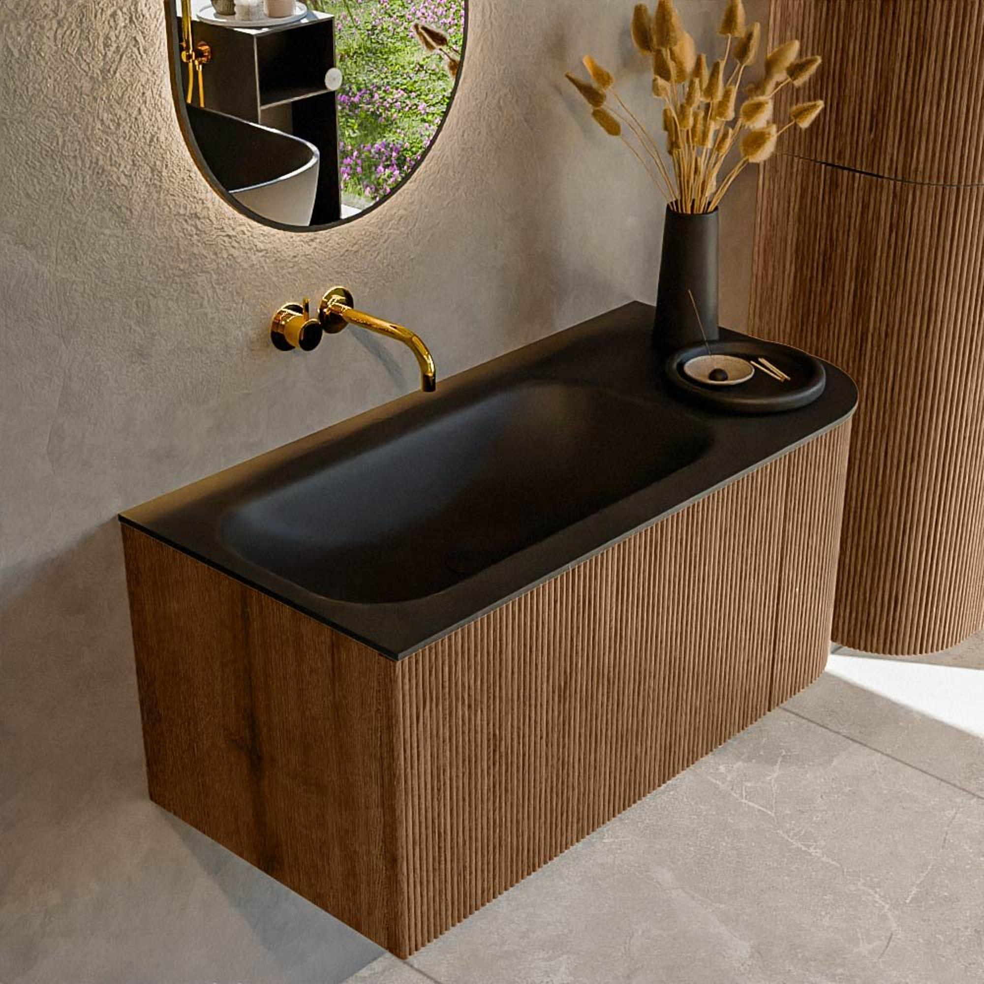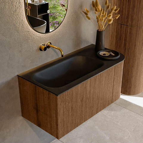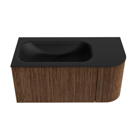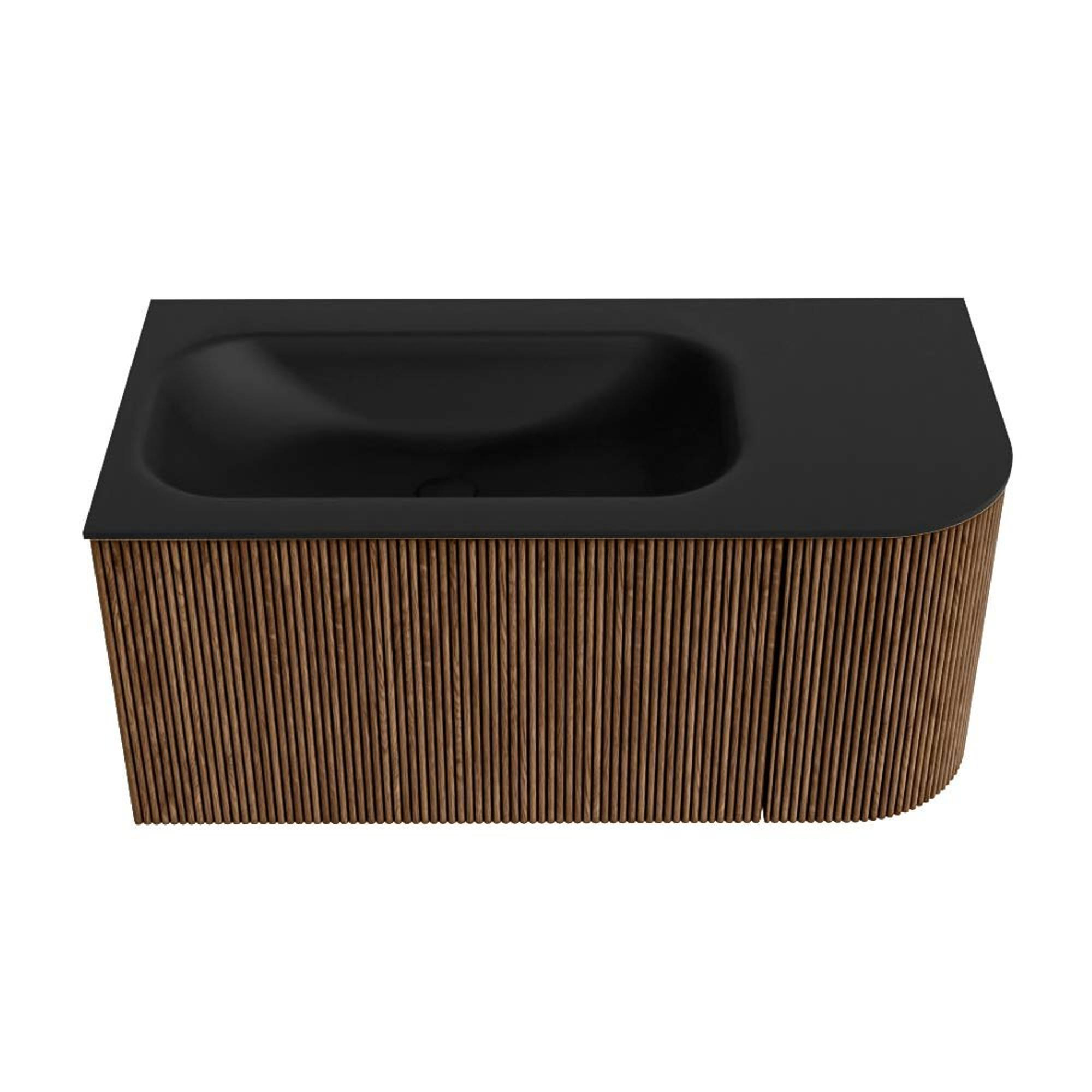 MONDIAZ KURVE 95cm badmeubel met module 25 R kleur Walnut met 1 lade en 1 deur. Wastafel BIG SMALL links zonder kraangat Urban.