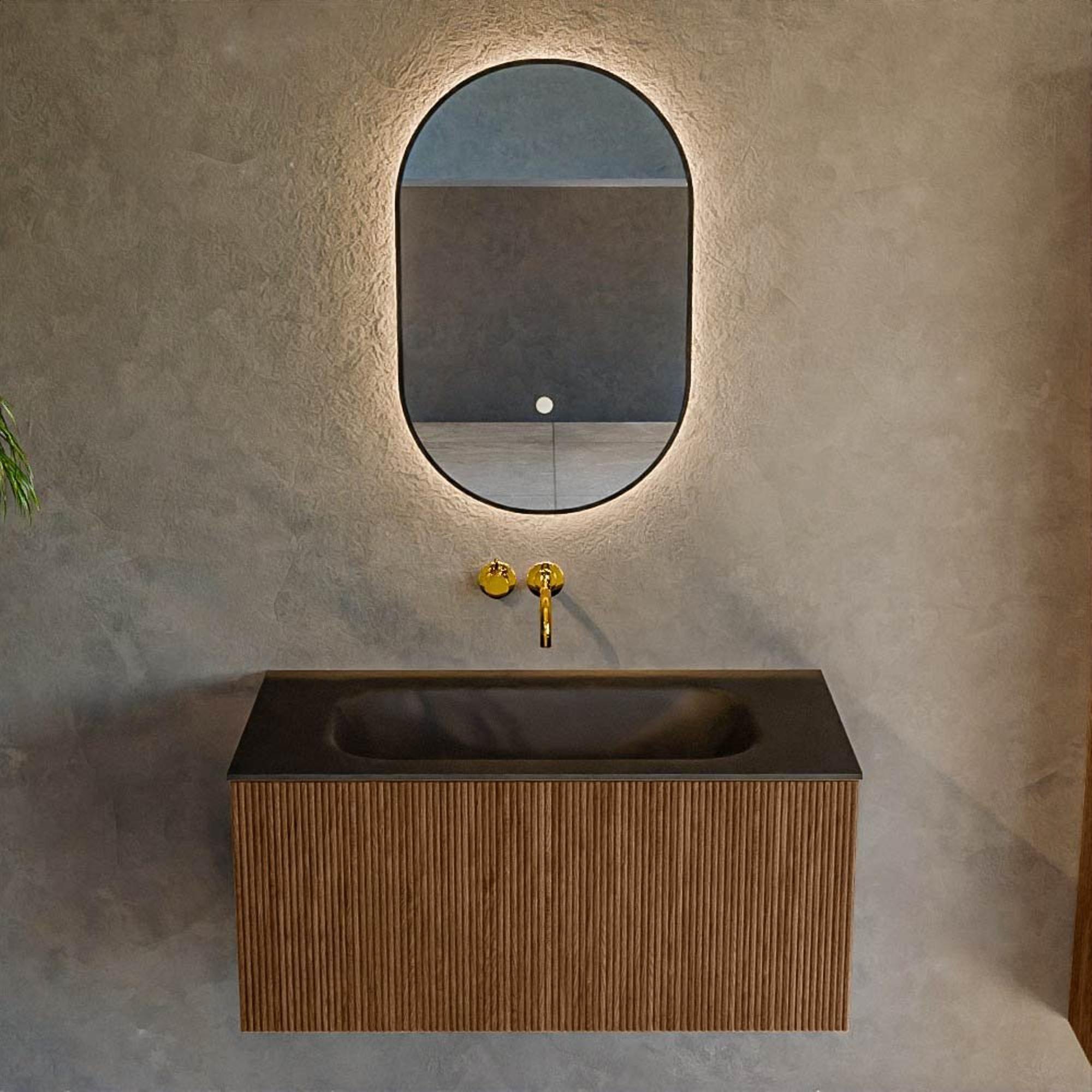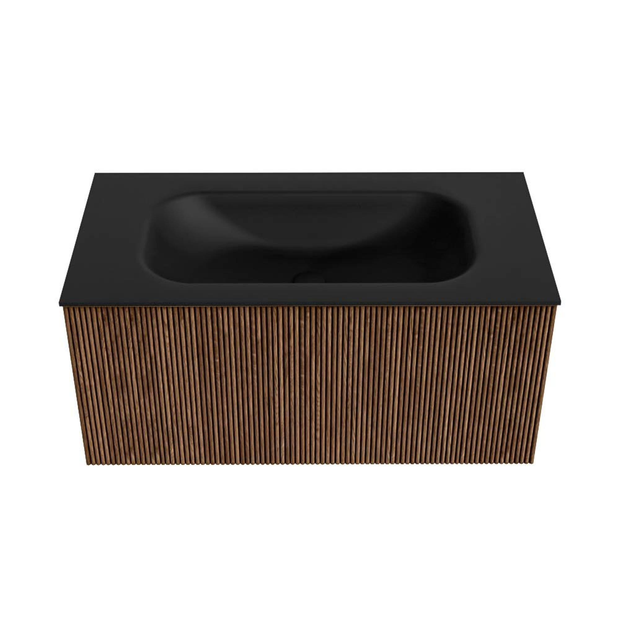MONDIAZ KURVE 90cm badmeubel kleur Walnut met 1 lade. Wastafel BIG SMALL midden zonder kraangat Urban.