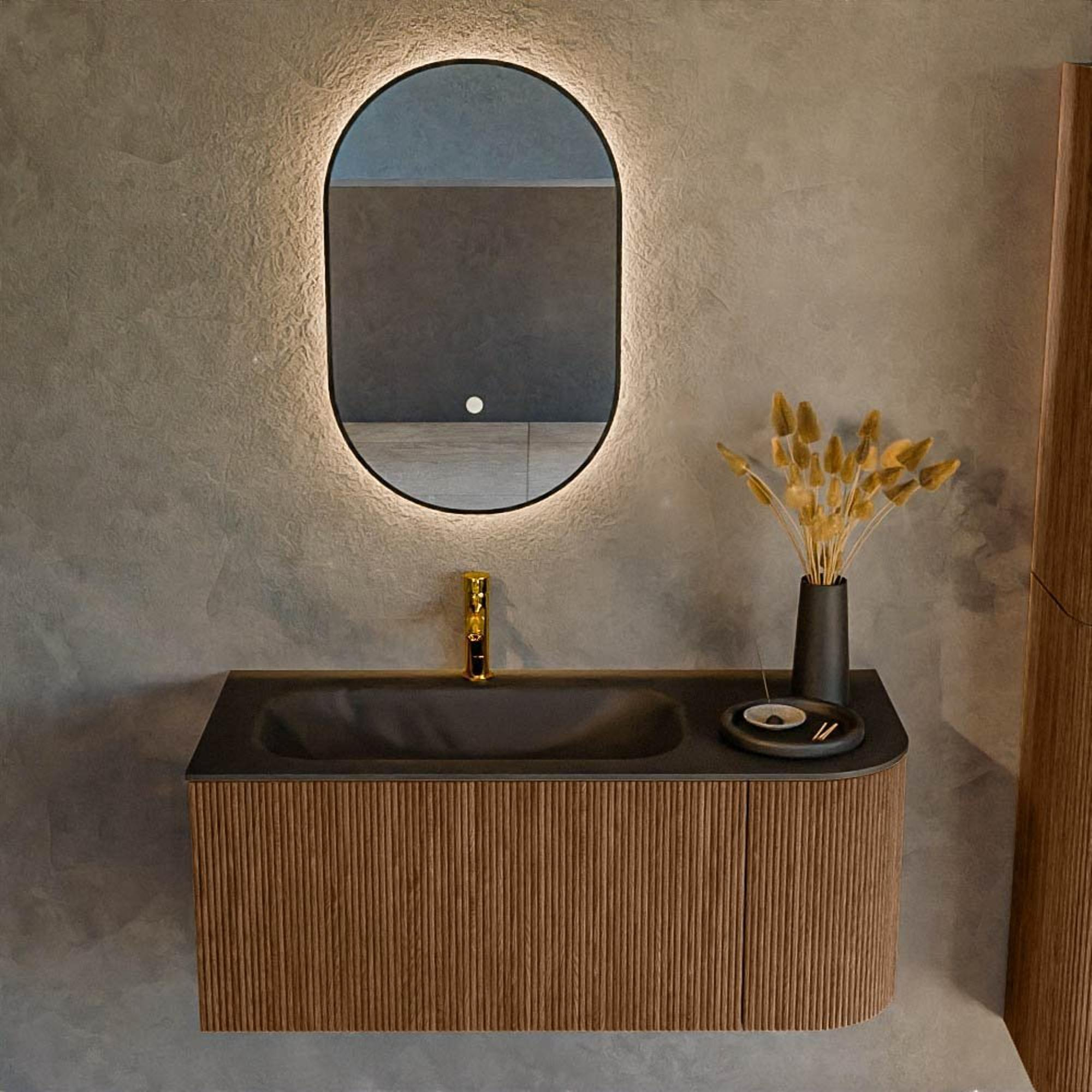 Het ultieme badmeubel dat je badkamer transformeert tot een oase van verfijning. Met zijn halfronde, verticale stroken van massief eiken, verkrijgbaar in de kleuren Oak en Walnut, straalt KURVE vakmanschap uit in elk detail. De zachte rondingen en slim ontworpen deurtjes, elk 40cm hoog, nodigen uit tot gebruik, terwijl de ruimte binnenin optimaal benut wordt dankzij de royale lade van dezelfde hoogte.