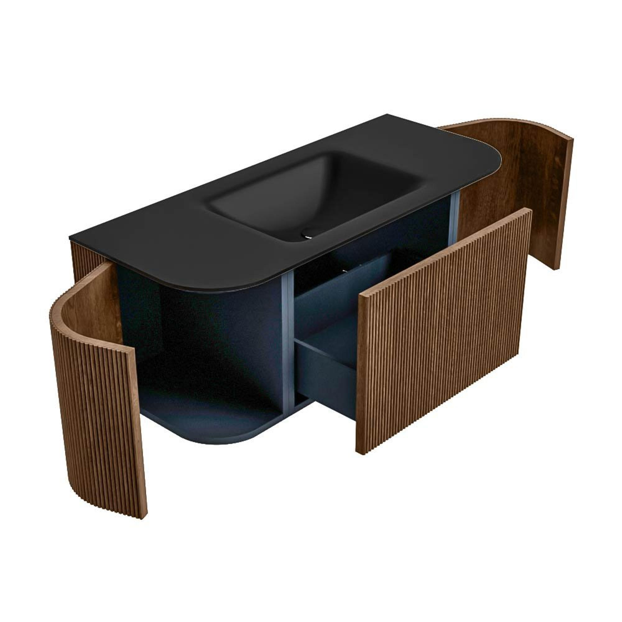 Het ultieme badmeubel dat je badkamer transformeert tot een oase van verfijning. Met zijn halfronde, verticale stroken van massief eiken, verkrijgbaar in de kleuren Oak en Walnut, straalt KURVE vakmanschap uit in elk detail. De zachte rondingen en slim ontworpen deurtjes, elk 40cm hoog, nodigen uit tot gebruik, terwijl de ruimte binnenin optimaal benut wordt dankzij de royale lade van dezelfde hoogte.