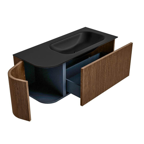 Het ultieme badmeubel dat je badkamer transformeert tot een oase van verfijning. Met zijn halfronde, verticale stroken van massief eiken, verkrijgbaar in de kleuren Oak en Walnut, straalt KURVE vakmanschap uit in elk detail. De zachte rondingen en slim ontworpen deurtjes, elk 40cm hoog, nodigen uit tot gebruik, terwijl de ruimte binnenin optimaal benut wordt dankzij de royale lade van dezelfde hoogte.