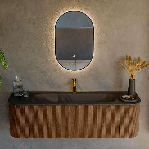 Het ultieme badmeubel dat je badkamer transformeert tot een oase van verfijning. Met zijn halfronde, verticale stroken van massief eiken, verkrijgbaar in de kleuren Oak en Walnut, straalt KURVE vakmanschap uit in elk detail. De zachte rondingen en slim ontworpen deurtjes, elk 40cm hoog, nodigen uit tot gebruik, terwijl de ruimte binnenin optimaal benut wordt dankzij de royale lade van dezelfde hoogte.