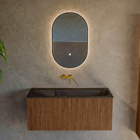 MONDIAZ KURVE 100cm badmeubel kleur Walnut met 1 lade. Wastafel BIG MEDIUM midden zonder kraangat Urban.