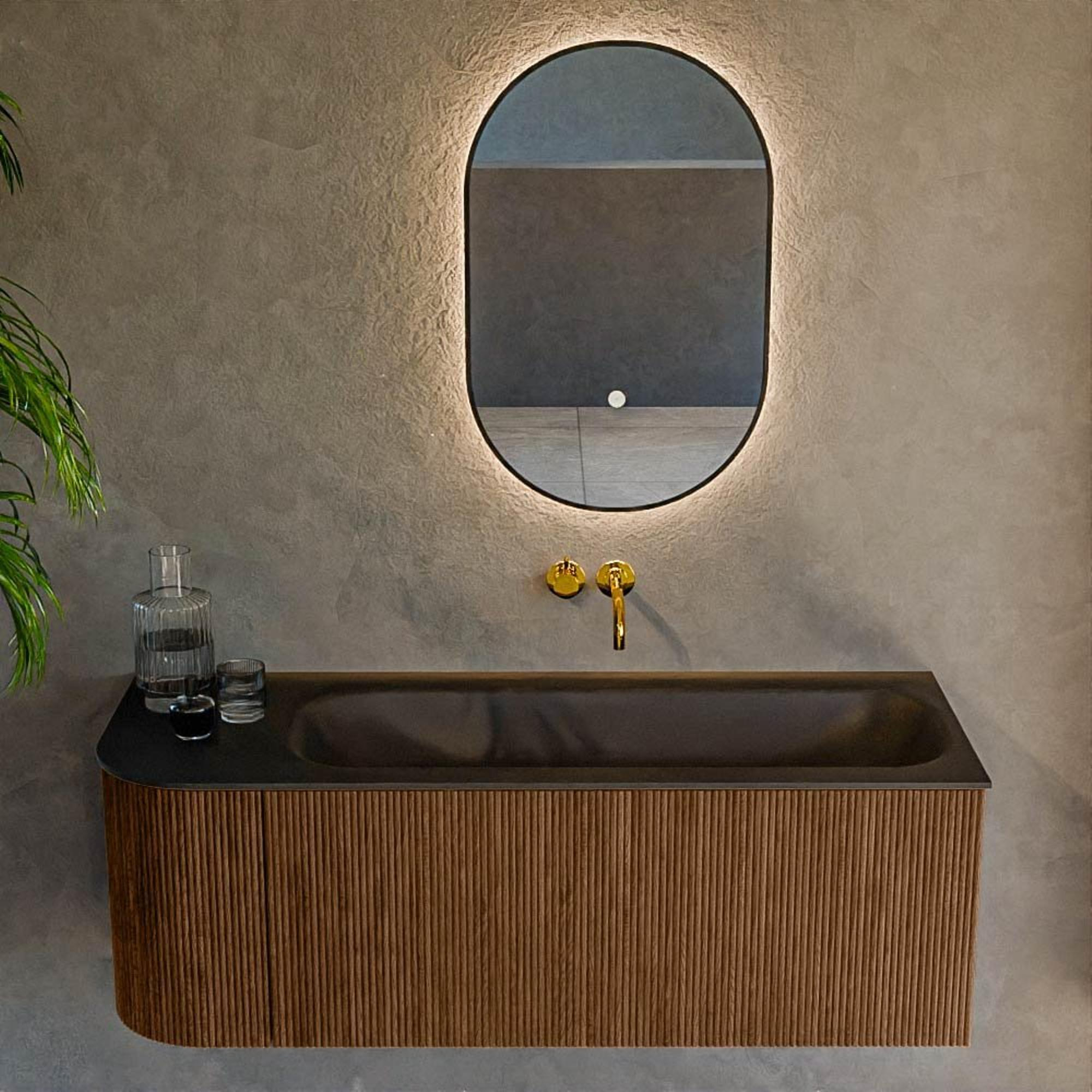 Het ultieme badmeubel dat je badkamer transformeert tot een oase van verfijning. Met zijn halfronde, verticale stroken van massief eiken, verkrijgbaar in de kleuren Oak en Walnut, straalt KURVE vakmanschap uit in elk detail. De zachte rondingen en slim ontworpen deurtjes, elk 40cm hoog, nodigen uit tot gebruik, terwijl de ruimte binnenin optimaal benut wordt dankzij de royale lade van dezelfde hoogte.