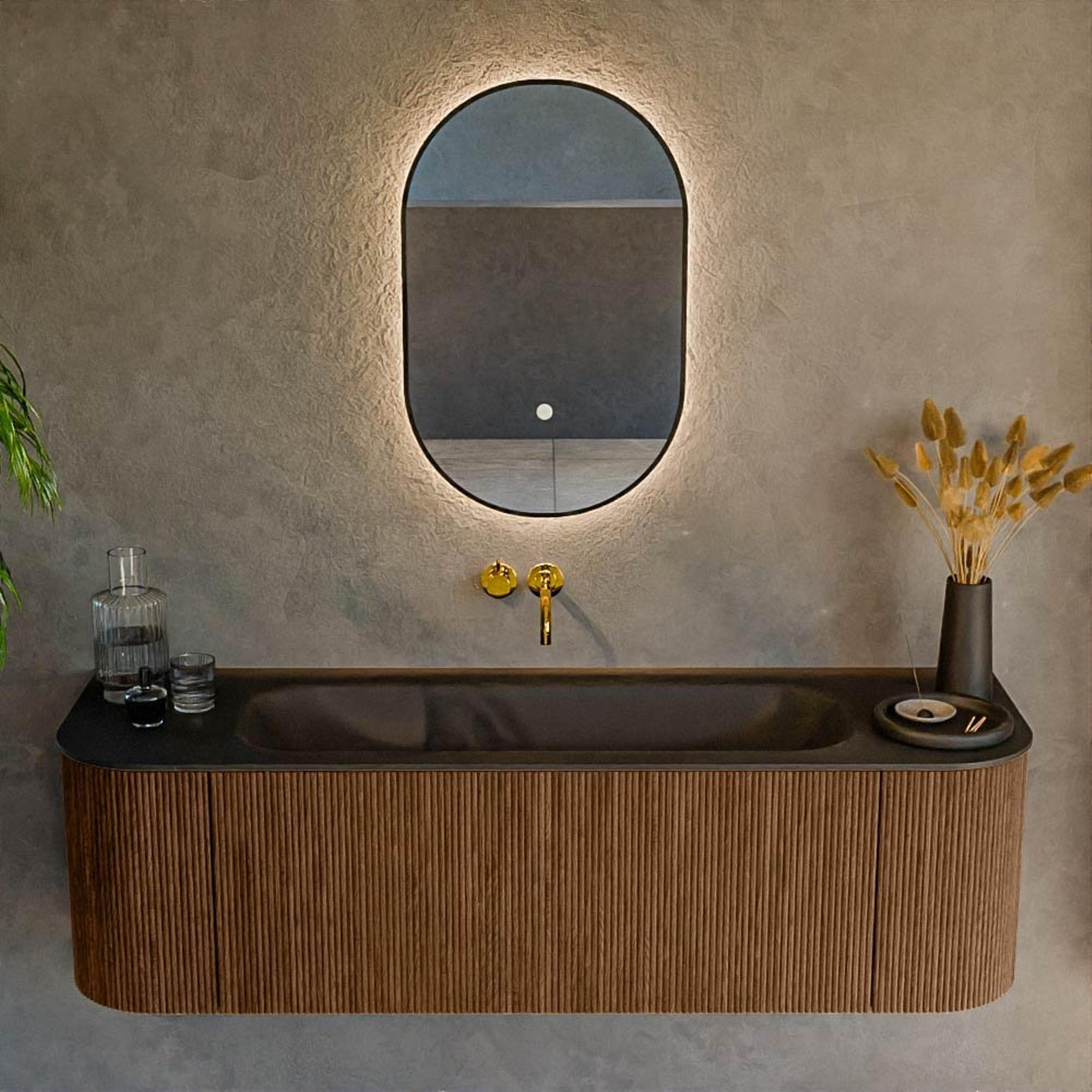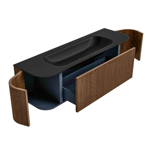 Het ultieme badmeubel dat je badkamer transformeert tot een oase van verfijning. Met zijn halfronde, verticale stroken van massief eiken, verkrijgbaar in de kleuren Oak en Walnut, straalt KURVE vakmanschap uit in elk detail. De zachte rondingen en slim ontworpen deurtjes, elk 40cm hoog, nodigen uit tot gebruik, terwijl de ruimte binnenin optimaal benut wordt dankzij de royale lade van dezelfde hoogte.