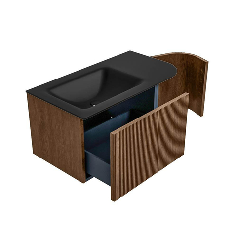 MONDIAZ KURVE 85cm badmeubel met module 25 R kleur Walnut met 1 lade en 1 deur. Wastafel CLOUD links 1 kraangat Urban.
