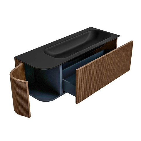 Het ultieme badmeubel dat je badkamer transformeert tot een oase van verfijning. Met zijn halfronde, verticale stroken van massief eiken, verkrijgbaar in de kleuren Oak en Walnut, straalt KURVE vakmanschap uit in elk detail. De zachte rondingen en slim ontworpen deurtjes, elk 40cm hoog, nodigen uit tot gebruik, terwijl de ruimte binnenin optimaal benut wordt dankzij de royale lade van dezelfde hoogte.