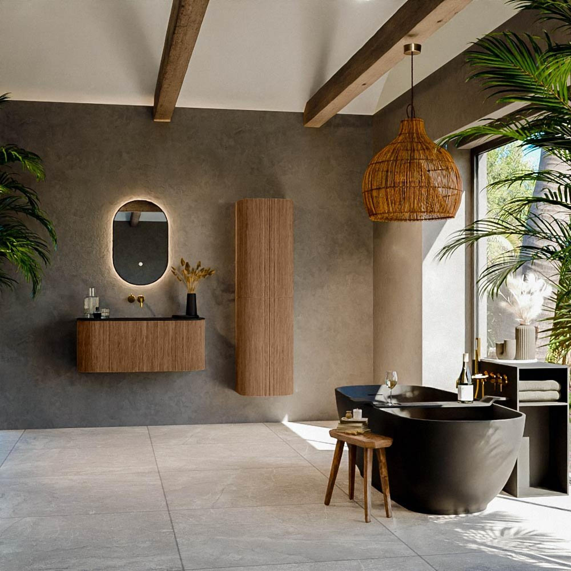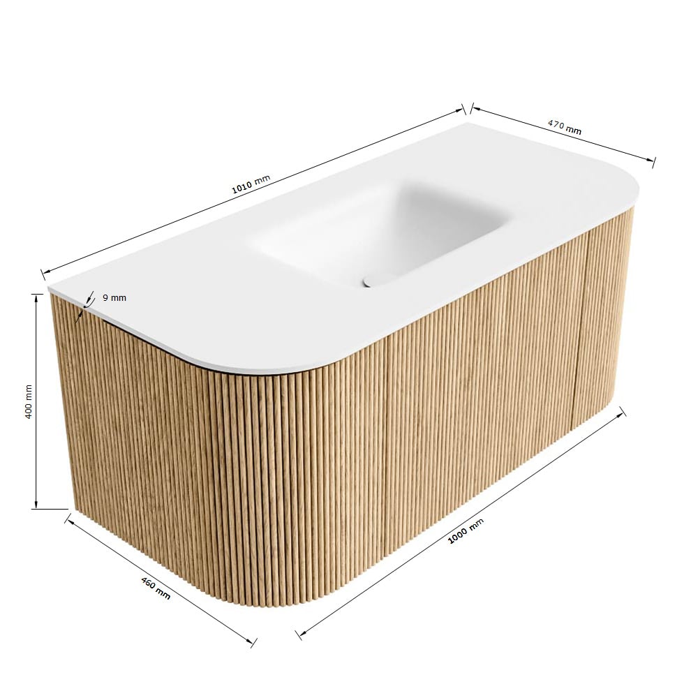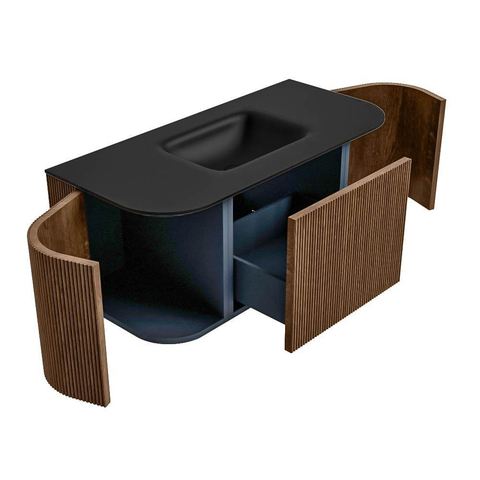 Het ultieme badmeubel dat je badkamer transformeert tot een oase van verfijning. Met zijn halfronde, verticale stroken van massief eiken, verkrijgbaar in de kleuren Oak en Walnut, straalt KURVE vakmanschap uit in elk detail. De zachte rondingen en slim ontworpen deurtjes, elk 40cm hoog, nodigen uit tot gebruik, terwijl de ruimte binnenin optimaal benut wordt dankzij de royale lade van dezelfde hoogte.