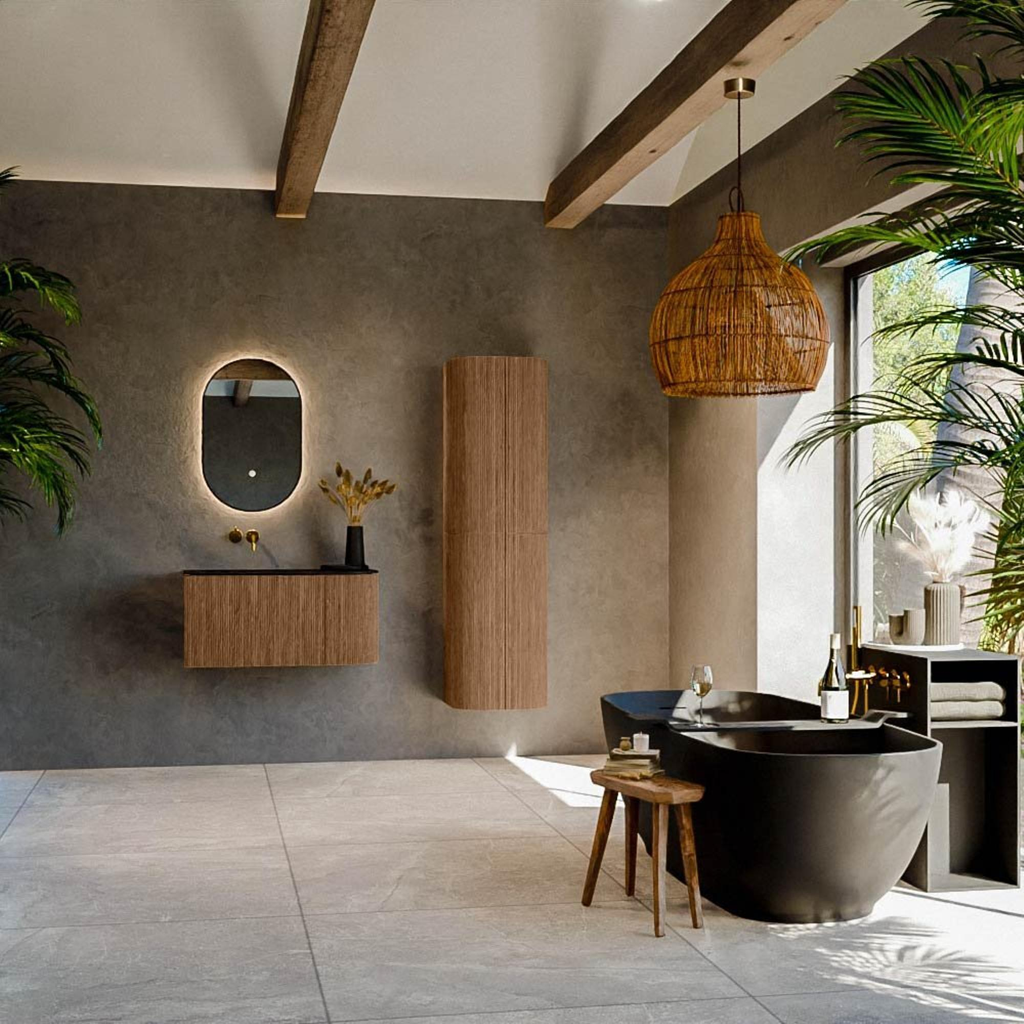 Het ultieme badmeubel dat je badkamer transformeert tot een oase van verfijning. Met zijn halfronde, verticale stroken van massief eiken, verkrijgbaar in de kleuren Oak en Walnut, straalt KURVE vakmanschap uit in elk detail. De zachte rondingen en slim ontworpen deurtjes, elk 40cm hoog, nodigen uit tot gebruik, terwijl de ruimte binnenin optimaal benut wordt dankzij de royale lade van dezelfde hoogte.