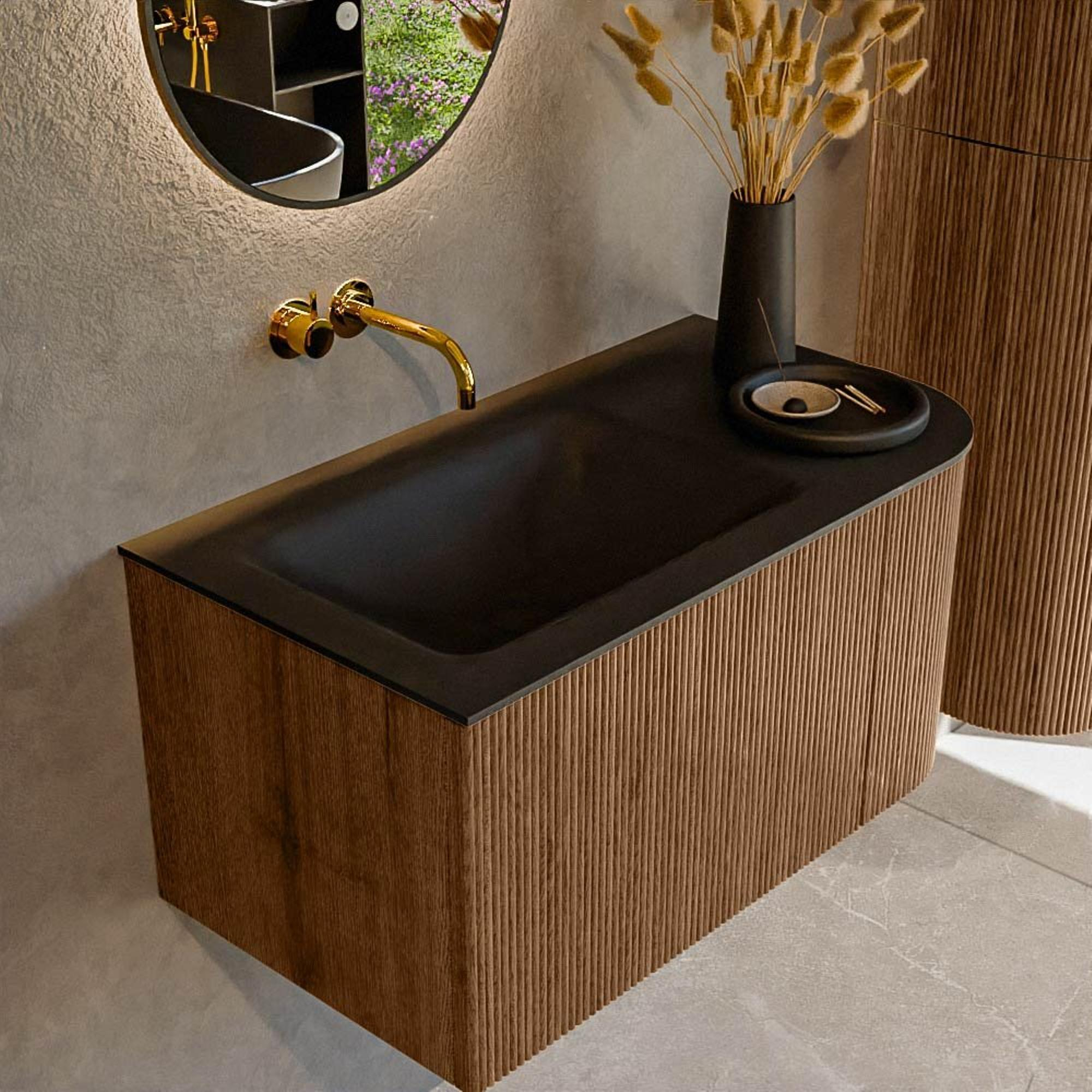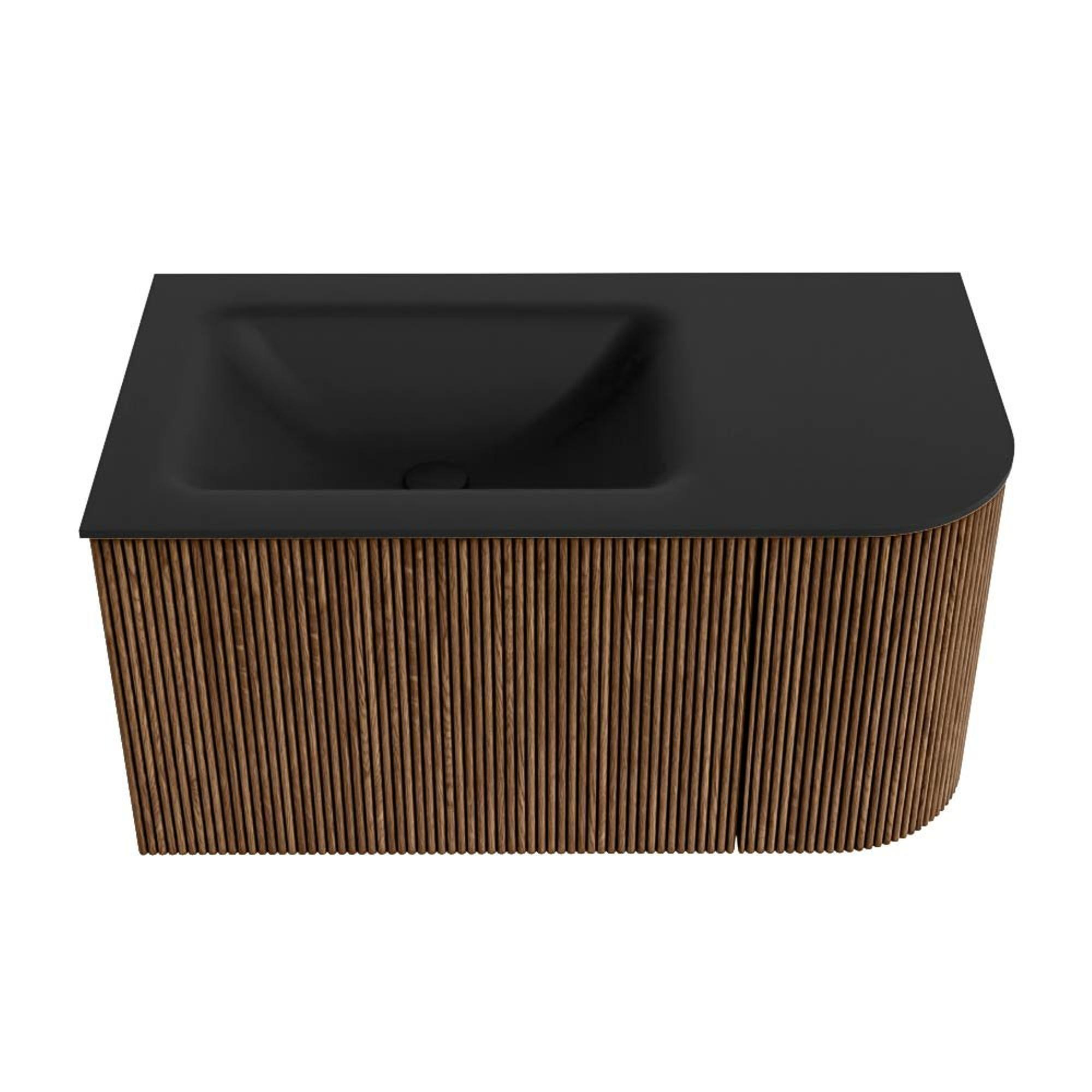 MONDIAZ KURVE 85cm badmeubel met module 25 R kleur Walnut met 1 lade en 1 deur. Wastafel CLOUD links zonder kraangat Urban.
