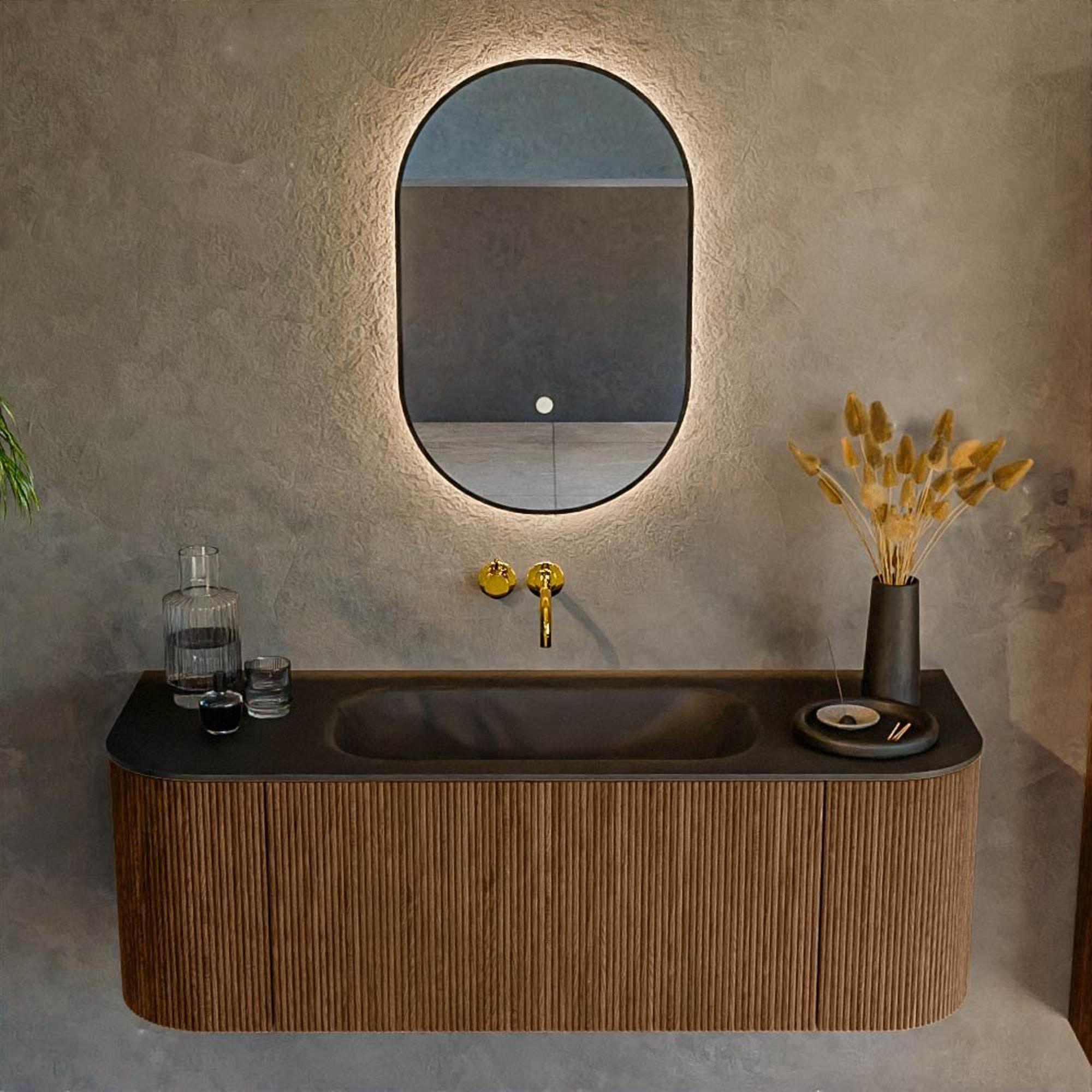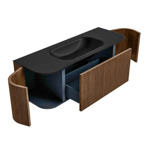 Het ultieme badmeubel dat je badkamer transformeert tot een oase van verfijning. Met zijn halfronde, verticale stroken van massief eiken, verkrijgbaar in de kleuren Oak en Walnut, straalt KURVE vakmanschap uit in elk detail. De zachte rondingen en slim ontworpen deurtjes, elk 40cm hoog, nodigen uit tot gebruik, terwijl de ruimte binnenin optimaal benut wordt dankzij de royale lade van dezelfde hoogte.