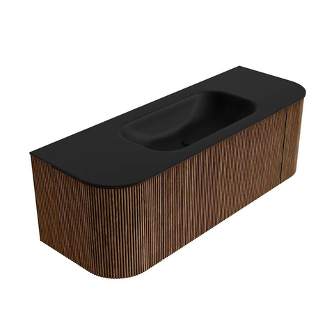 MONDIAZ KURVE 130cm badmeubel met module 25 Len R kleur Walnut met 1 lade en 2 deuren. Wastafel BIG SMALL midden zonder kraangat Urban.