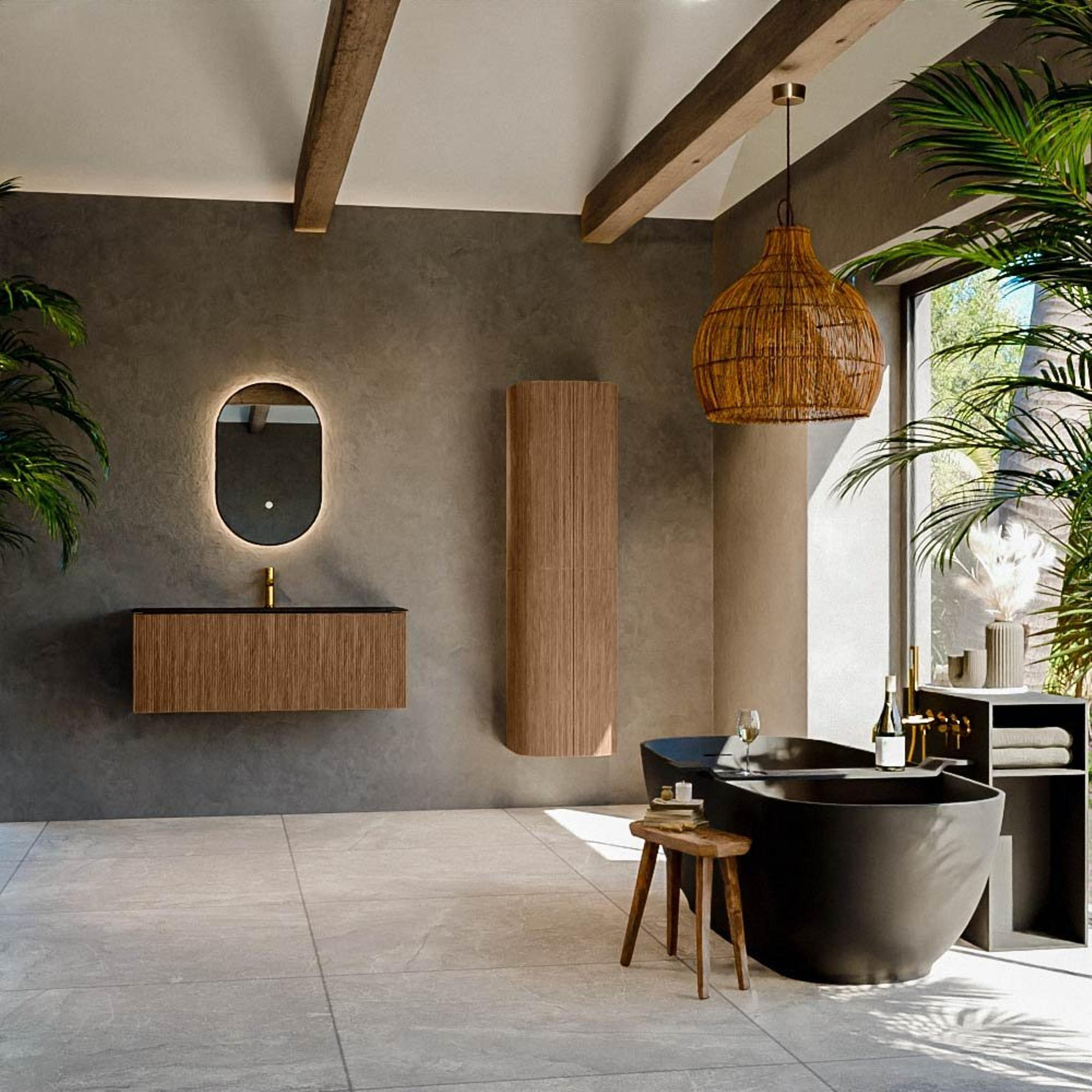 Het ultieme badmeubel dat je badkamer transformeert tot een oase van verfijning. Met zijn halfronde, verticale stroken van massief eiken, verkrijgbaar in de kleuren Oak en Walnut, straalt KURVE vakmanschap uit in elk detail. De zachte rondingen en slim ontworpen deurtjes, elk 40cm hoog, nodigen uit tot gebruik, terwijl de ruimte binnenin optimaal benut wordt dankzij de royale lade van dezelfde hoogte.