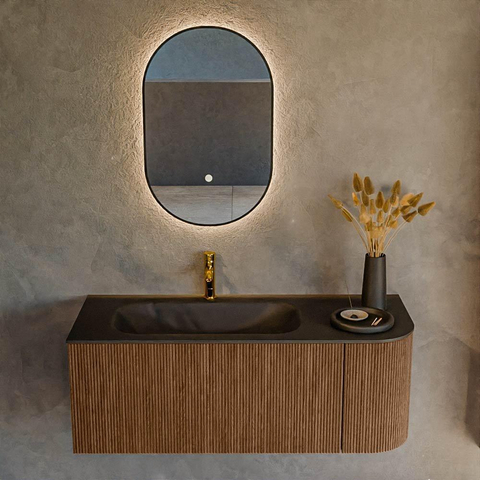 Het ultieme badmeubel dat je badkamer transformeert tot een oase van verfijning. Met zijn halfronde, verticale stroken van massief eiken, verkrijgbaar in de kleuren Oak en Walnut, straalt KURVE vakmanschap uit in elk detail. De zachte rondingen en slim ontworpen deurtjes, elk 40cm hoog, nodigen uit tot gebruik, terwijl de ruimte binnenin optimaal benut wordt dankzij de royale lade van dezelfde hoogte.