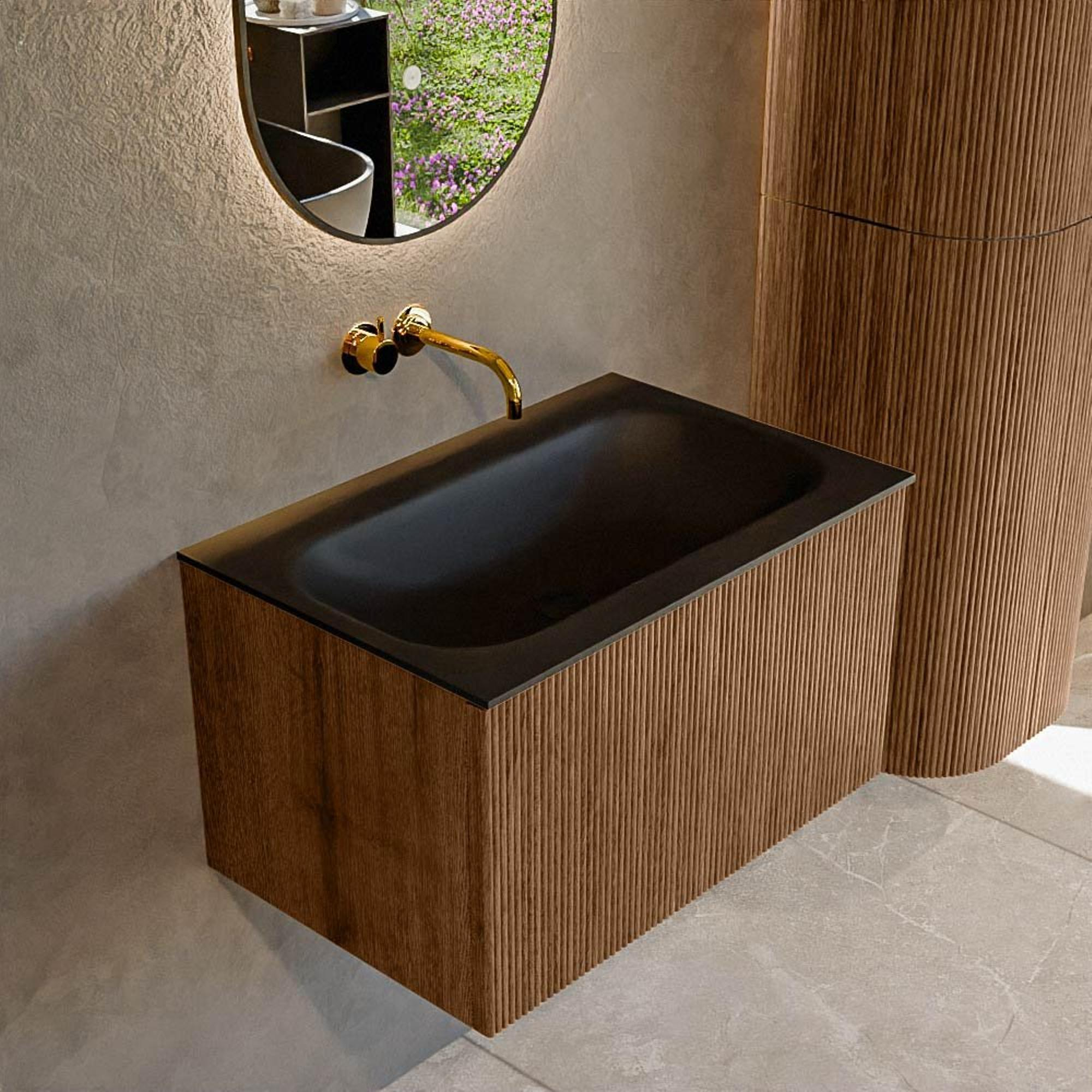 MONDIAZ KURVE 70cm badmeubel kleur Walnut met 1 lade. Wastafel BIG SMALL midden zonder kraangat Urban.
