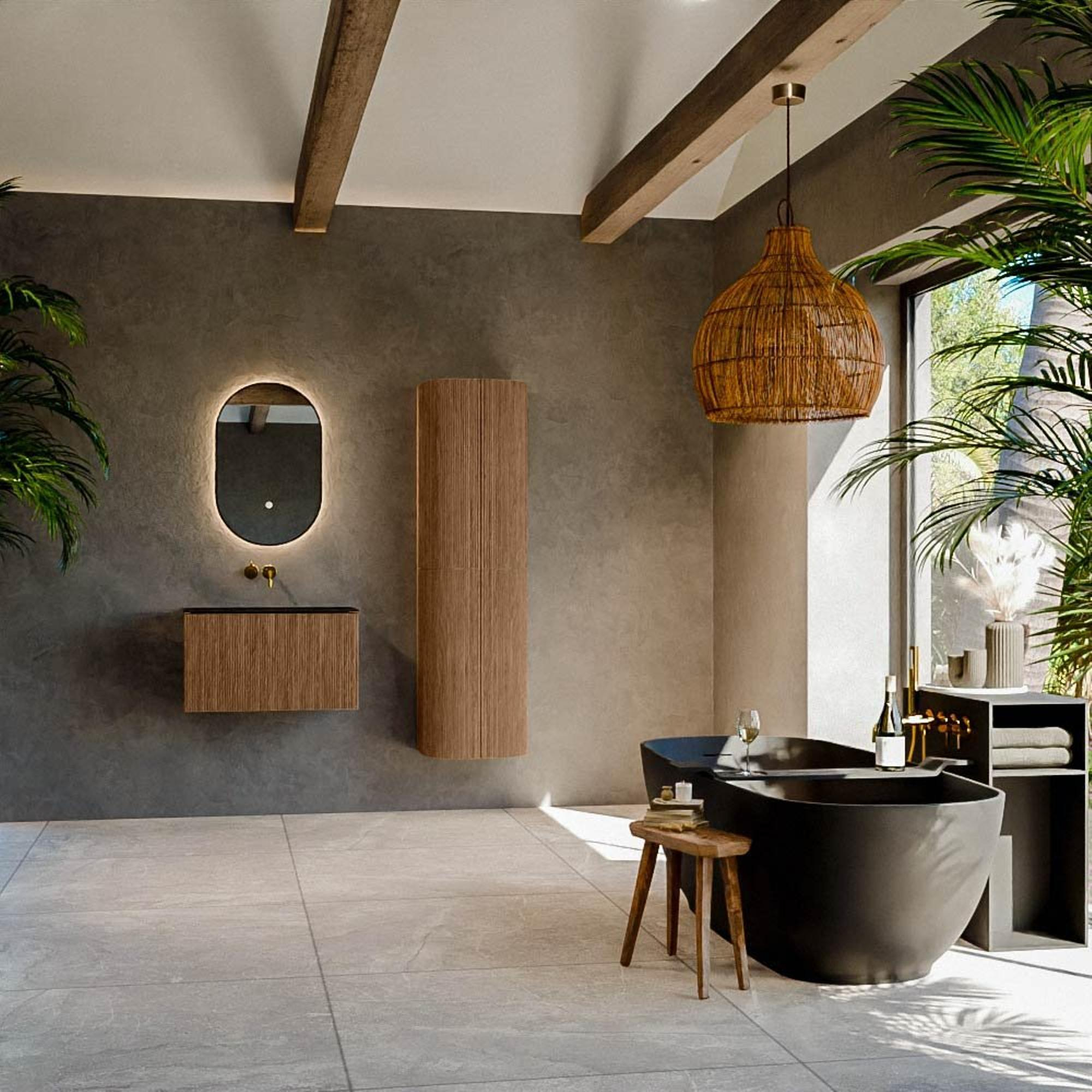 Het ultieme badmeubel dat je badkamer transformeert tot een oase van verfijning. Met zijn halfronde, verticale stroken van massief eiken, verkrijgbaar in de kleuren Oak en Walnut, straalt KURVE vakmanschap uit in elk detail. De zachte rondingen en slim ontworpen deurtjes, elk 40cm hoog, nodigen uit tot gebruik, terwijl de ruimte binnenin optimaal benut wordt dankzij de royale lade van dezelfde hoogte.