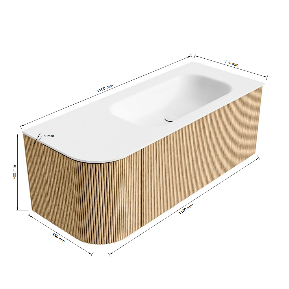 Het ultieme badmeubel dat je badkamer transformeert tot een oase van verfijning. Met zijn halfronde, verticale stroken van massief eiken, verkrijgbaar in de kleuren Oak en Walnut, straalt KURVE vakmanschap uit in elk detail. De zachte rondingen en slim ontworpen deurtjes, elk 40cm hoog, nodigen uit tot gebruik, terwijl de ruimte binnenin optimaal benut wordt dankzij de royale lade van dezelfde hoogte.