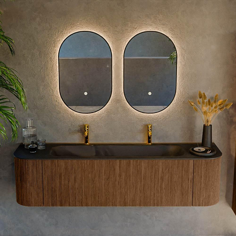Het ultieme badmeubel dat je badkamer transformeert tot een oase van verfijning. Met zijn halfronde, verticale stroken van massief eiken, verkrijgbaar in de kleuren Oak en Walnut, straalt KURVE vakmanschap uit in elk detail. De zachte rondingen en slim ontworpen deurtjes, elk 40cm hoog, nodigen uit tot gebruik, terwijl de ruimte binnenin optimaal benut wordt dankzij de royale lade van dezelfde hoogte.