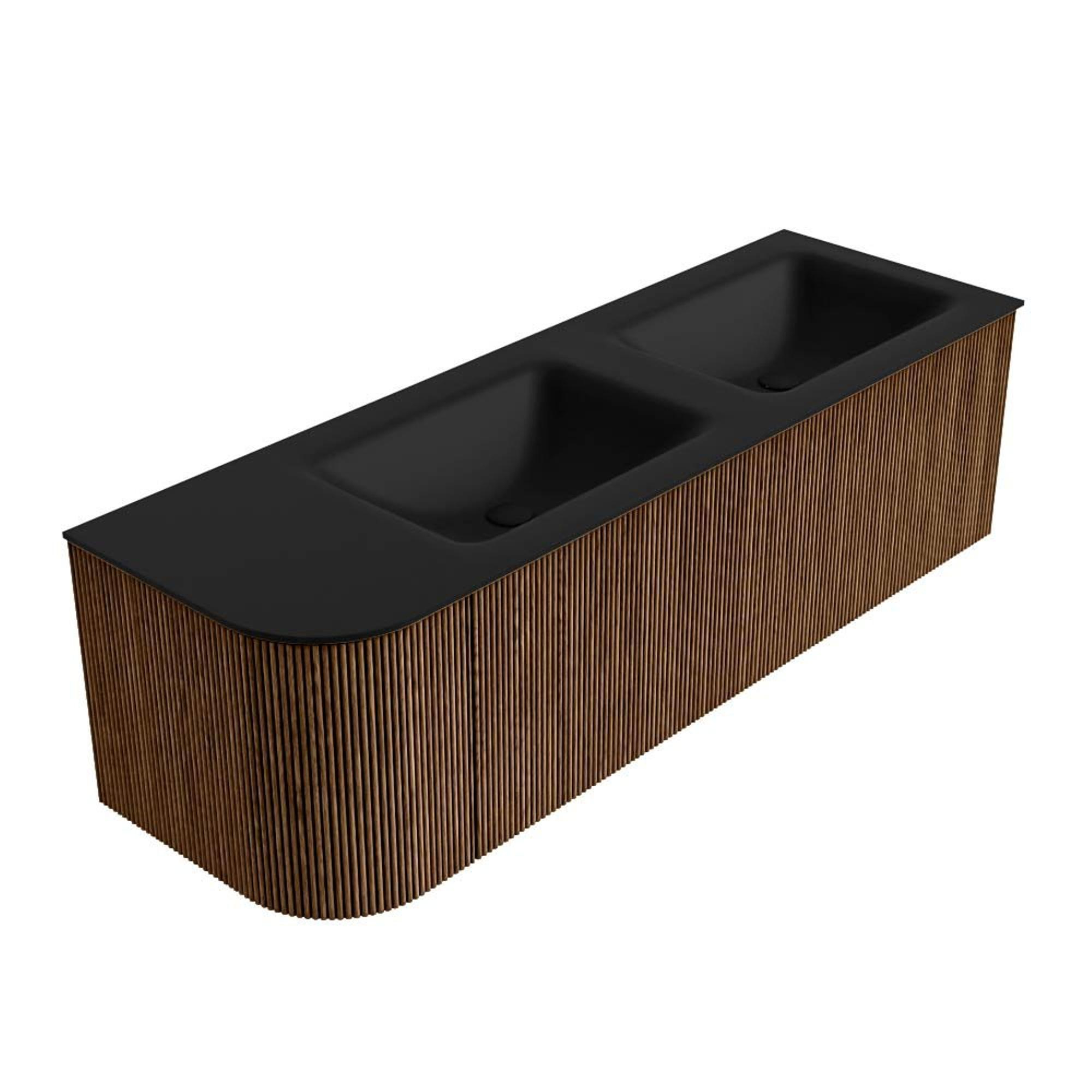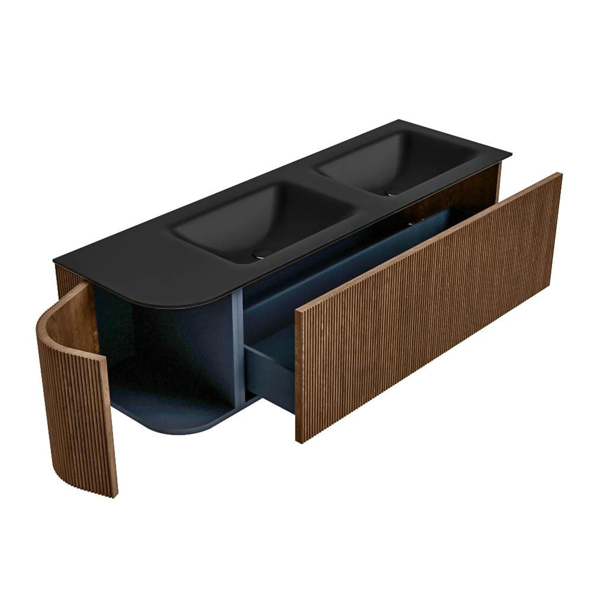MONDIAZ KURVE 145cm badmeubel met module 25 L kleur Walnut met 1 lade en 1 deur. Wastafel CLOUD dubbel / rechts zonder kraangat Urban.