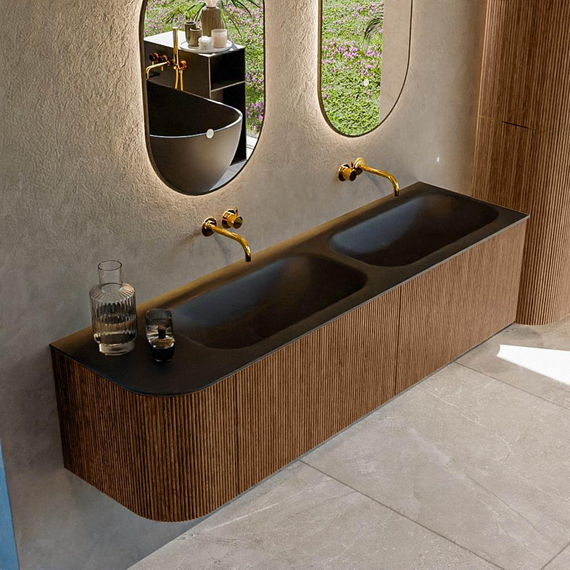 Het ultieme badmeubel dat je badkamer transformeert tot een oase van verfijning. Met zijn halfronde, verticale stroken van massief eiken, verkrijgbaar in de kleuren Oak en Walnut, straalt KURVE vakmanschap uit in elk detail. De zachte rondingen en slim ontworpen deurtjes, elk 40cm hoog, nodigen uit tot gebruik, terwijl de ruimte binnenin optimaal benut wordt dankzij de royale lade van dezelfde hoogte.