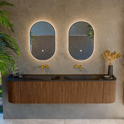 Het ultieme badmeubel dat je badkamer transformeert tot een oase van verfijning. Met zijn halfronde, verticale stroken van massief eiken, verkrijgbaar in de kleuren Oak en Walnut, straalt KURVE vakmanschap uit in elk detail. De zachte rondingen en slim ontworpen deurtjes, elk 40cm hoog, nodigen uit tot gebruik, terwijl de ruimte binnenin optimaal benut wordt dankzij de royale lade van dezelfde hoogte.