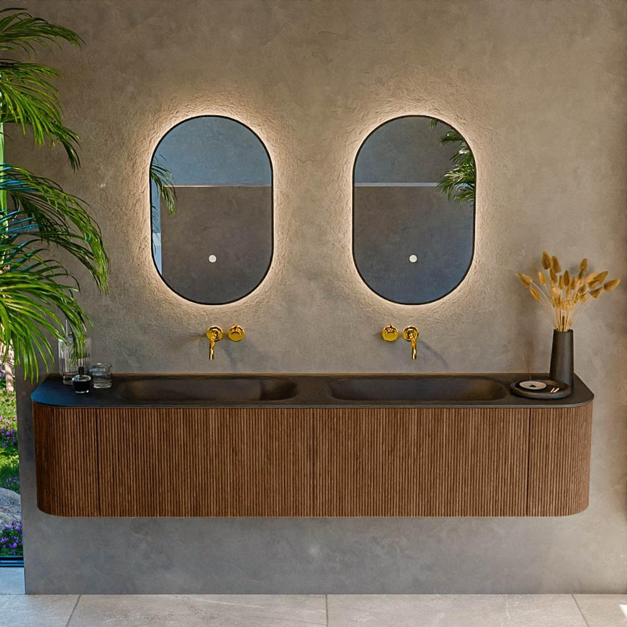 Het ultieme badmeubel dat je badkamer transformeert tot een oase van verfijning. Met zijn halfronde, verticale stroken van massief eiken, verkrijgbaar in de kleuren Oak en Walnut, straalt KURVE vakmanschap uit in elk detail. De zachte rondingen en slim ontworpen deurtjes, elk 40cm hoog, nodigen uit tot gebruik, terwijl de ruimte binnenin optimaal benut wordt dankzij de royale lade van dezelfde hoogte.