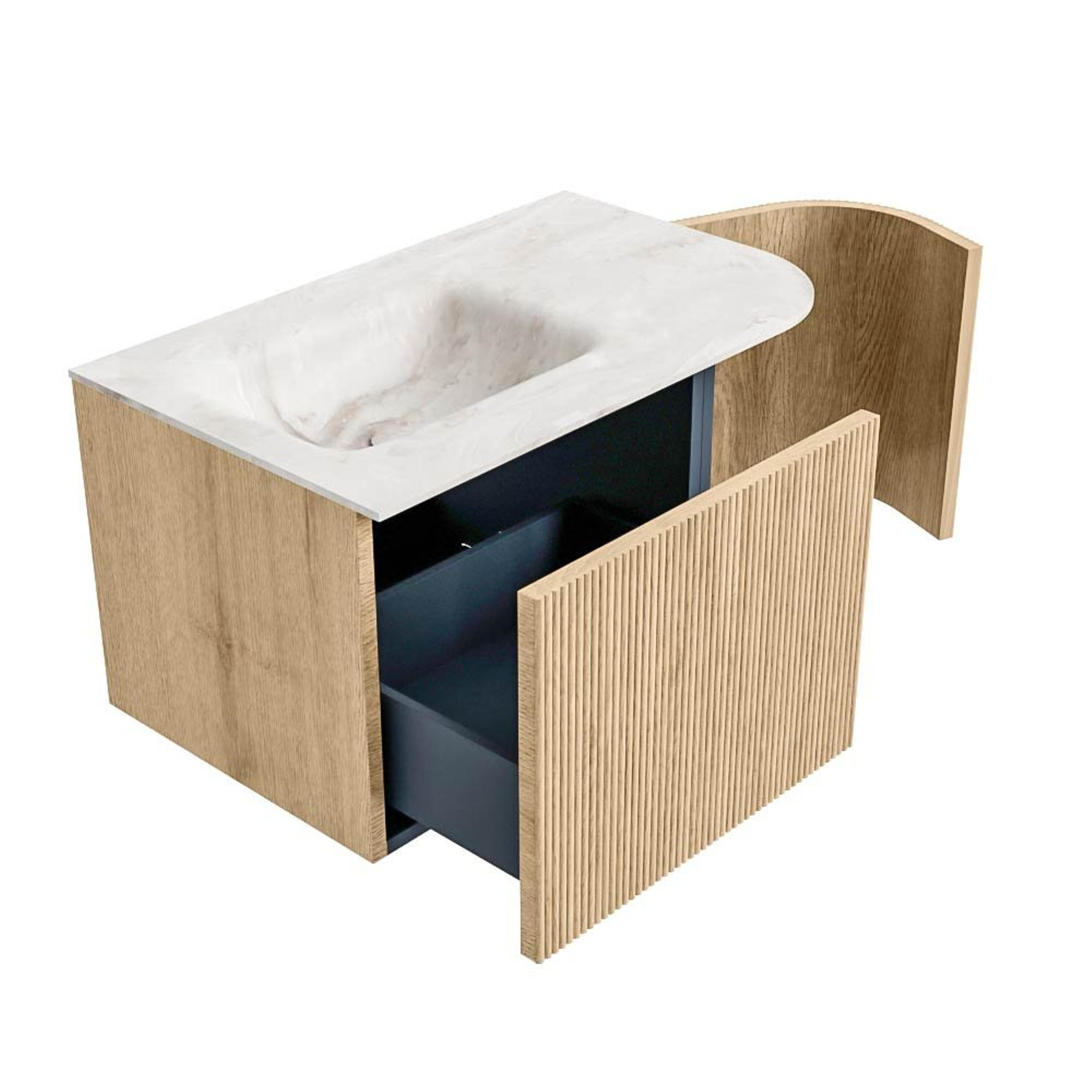 MONDIAZ KURVE-DLUX 75cm badmeubel met module 25 R kleur Oak met 1 lade en 1 deur. Wastafel GRUNNE links zonder kraangat kleur Frappe.
