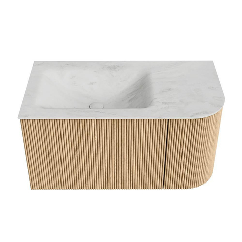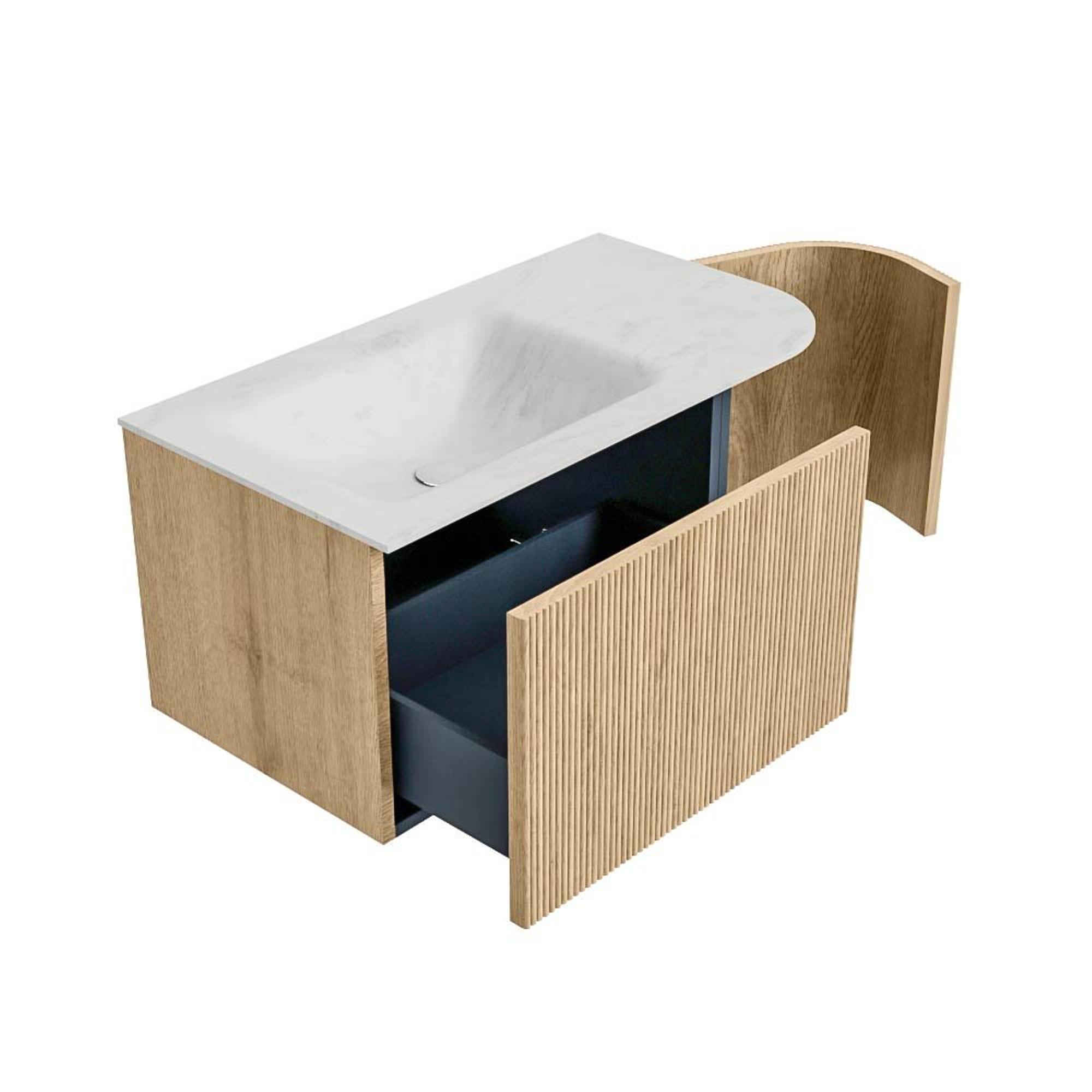 MONDIAZ KURVE-DLUX 85cm badmeubel met module 25 R kleur Oak met 1 lade en 1 deur. Wastafel CLOUD links zonder kraangat kleur Opalo.