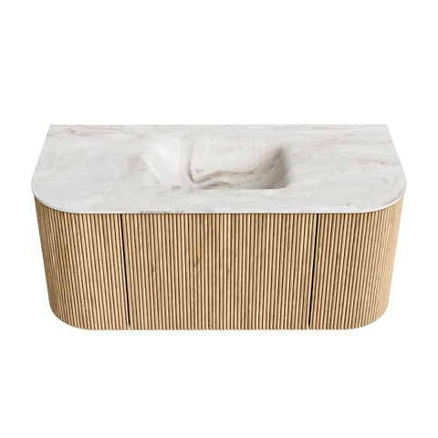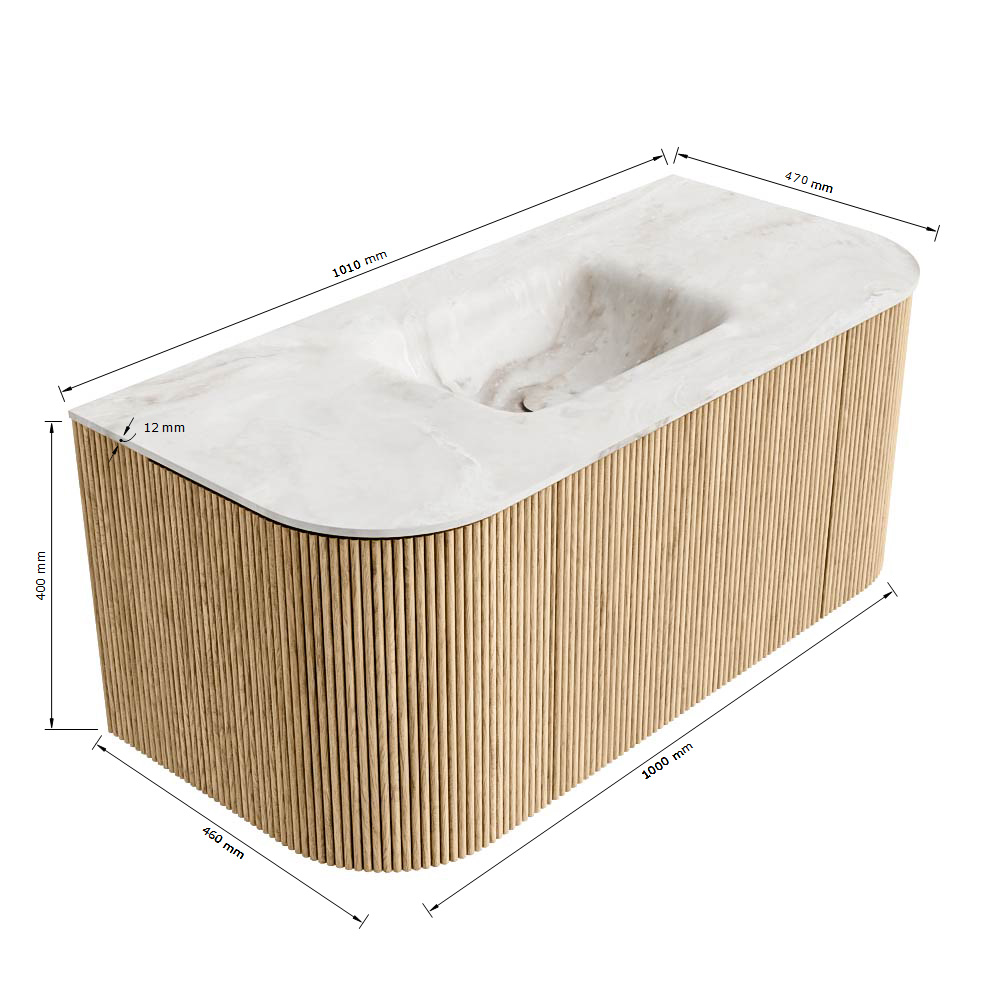 Het ultieme badmeubel dat je badkamer transformeert tot een oase van verfijning. Met zijn halfronde, verticale stroken van massief eiken, verkrijgbaar in de kleuren Oak en Walnut, straalt KURVE vakmanschap uit in elk detail. De zachte rondingen en slim ontworpen deurtjes, elk 40cm hoog, nodigen uit tot gebruik, terwijl de ruimte binnenin optimaal benut wordt dankzij de royale lade van dezelfde hoogte.