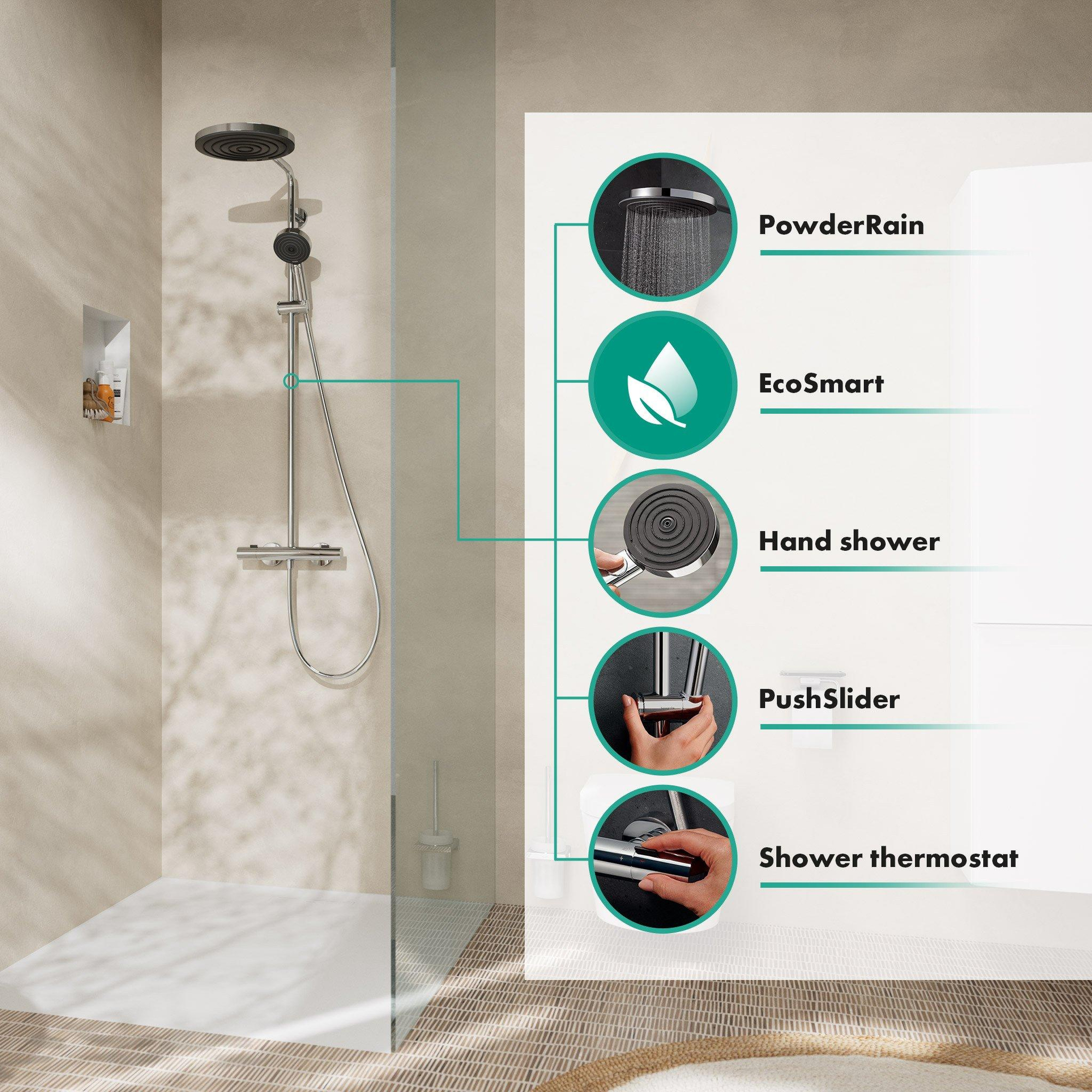 Puur design - puur doucheplezier. hansgrohe douchesysteem met EcoSmart en PowderRain